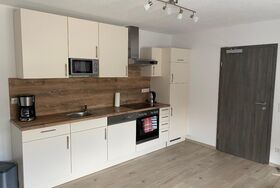 Küchenausstattung: Spülmaschine, Kühlschrank mit Eisfach, Elektroherd mit Backofen, Toaster, Wasserkocher, Kaffeemaschine, Geschirr, Besteck, Gläser, Pfanne und Töpfe