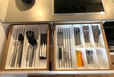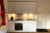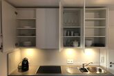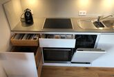 - gut ausgestattete Küchenzeile mit Backofen, Kochfeld, Dunstabzug, Spülmaschine, Kaffeemaschine, Kühlschrank, Geschirr, Töpfe, Besteck