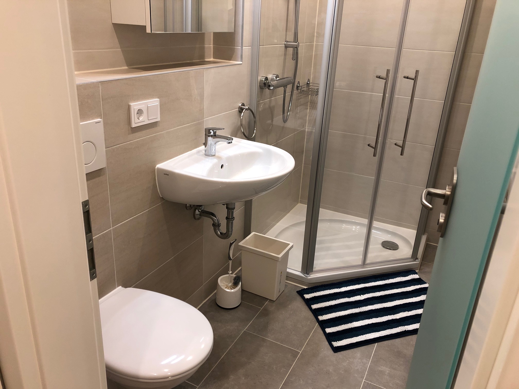 Bad mit Dusche und WC, Handtuchheizkörper, Fön, Spiegelschrank