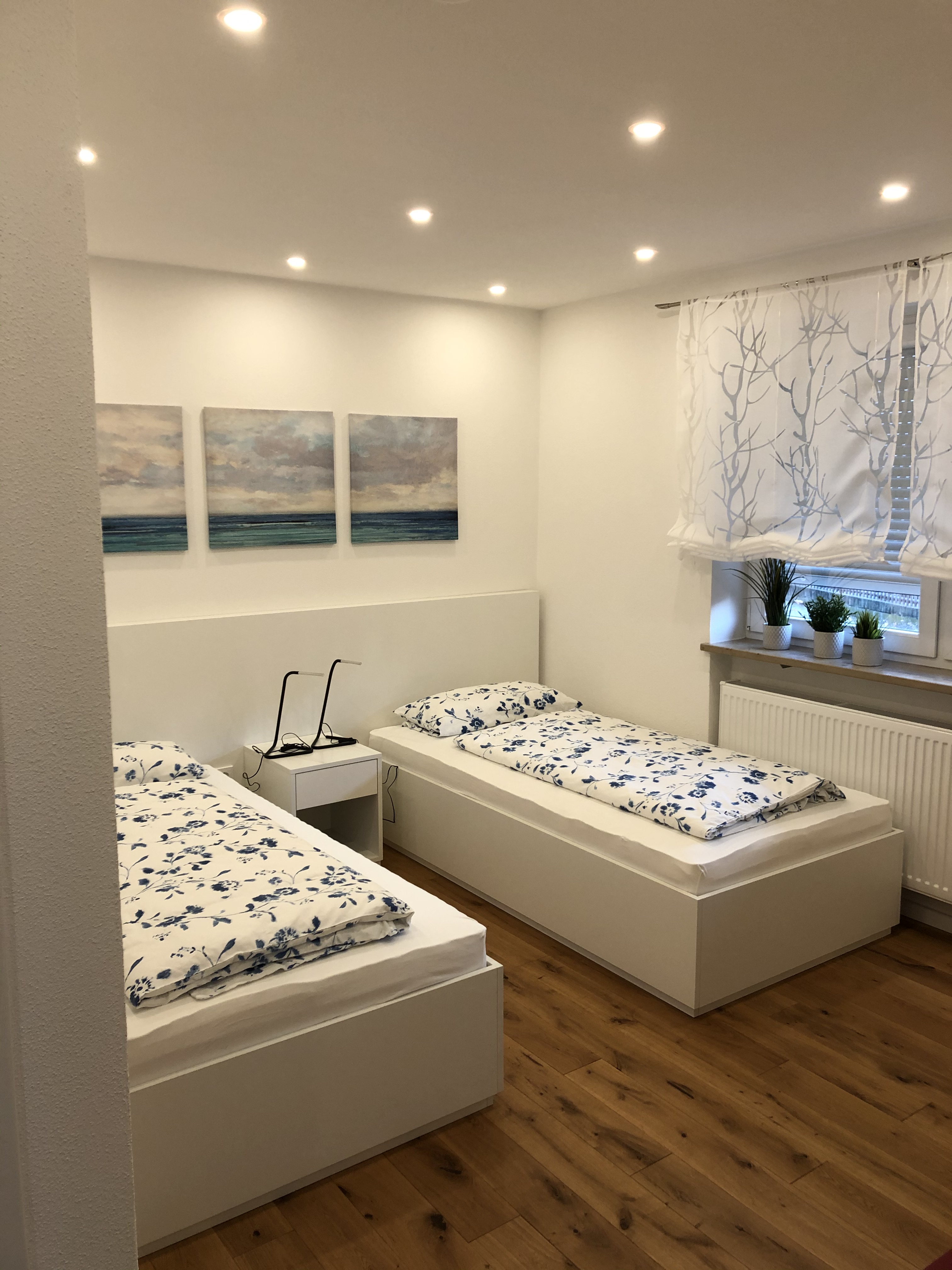 Schlafzimmer: zwei Einzelbetten, Smart-TV, Kleiderschrank