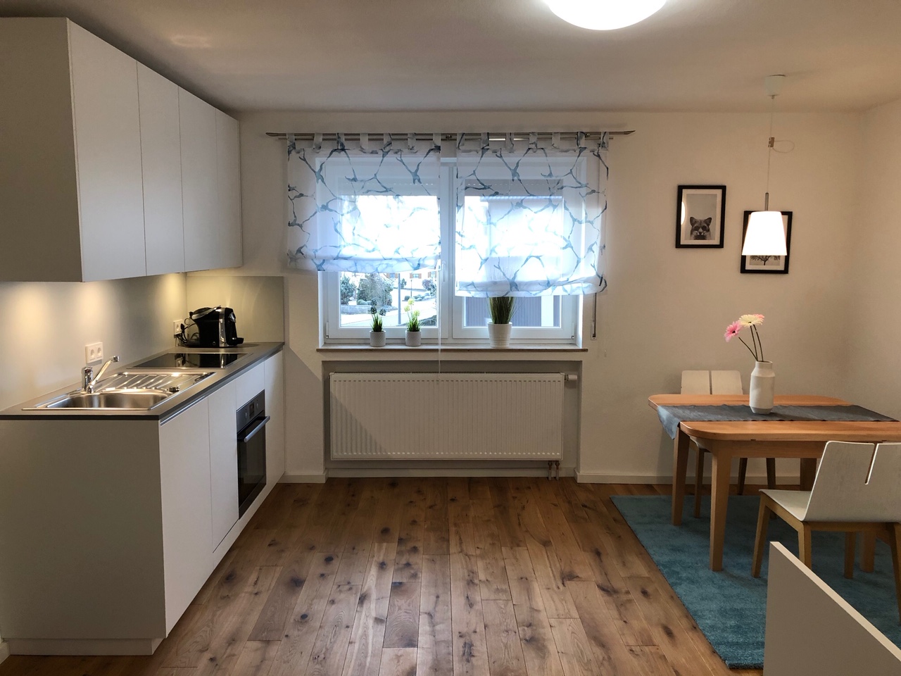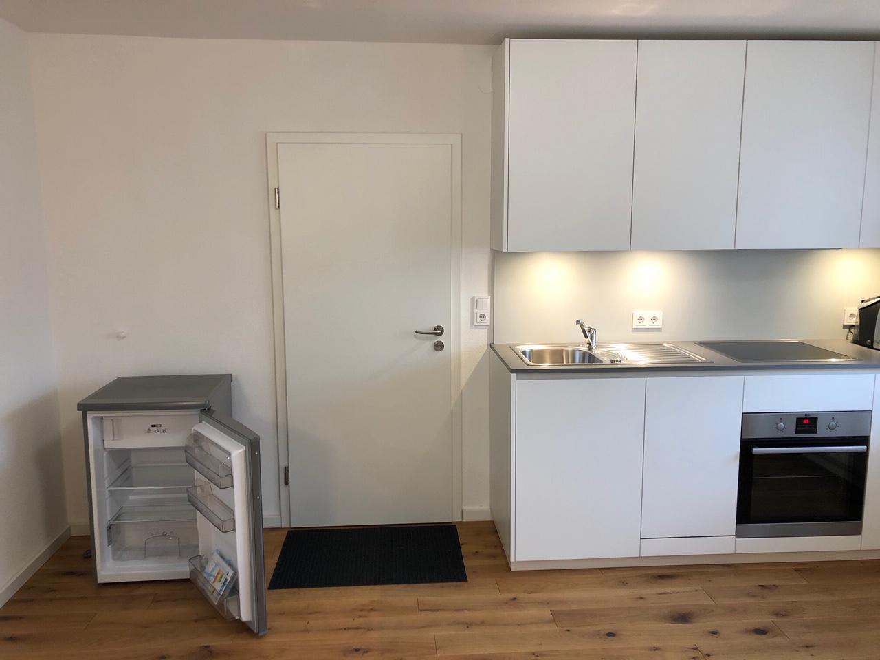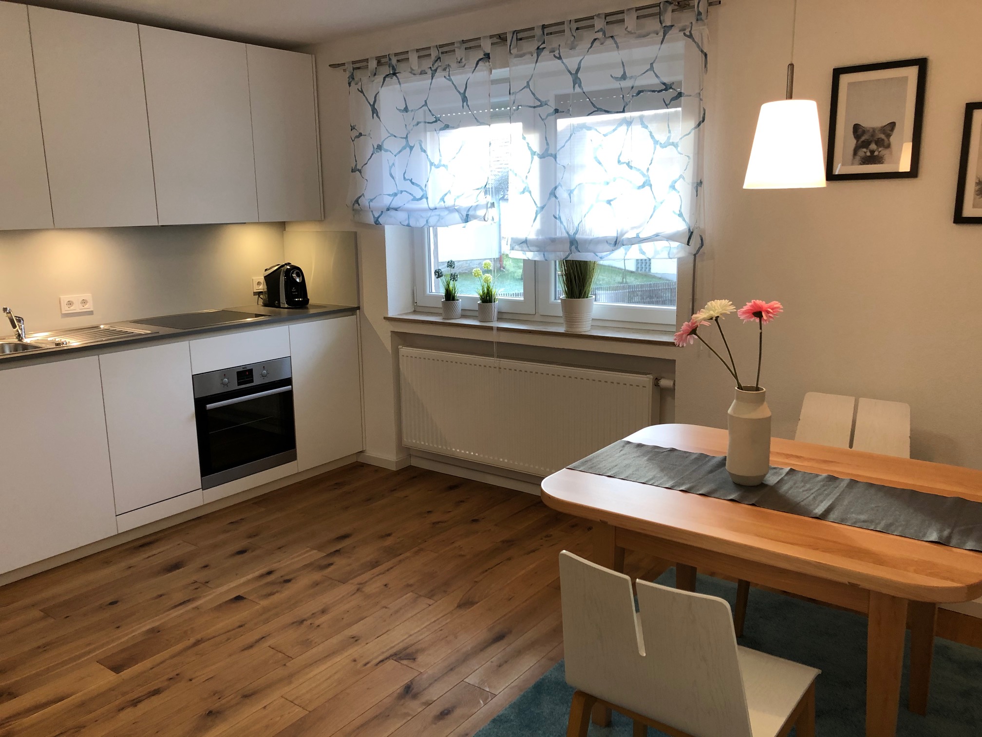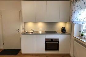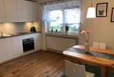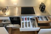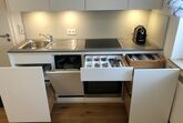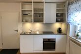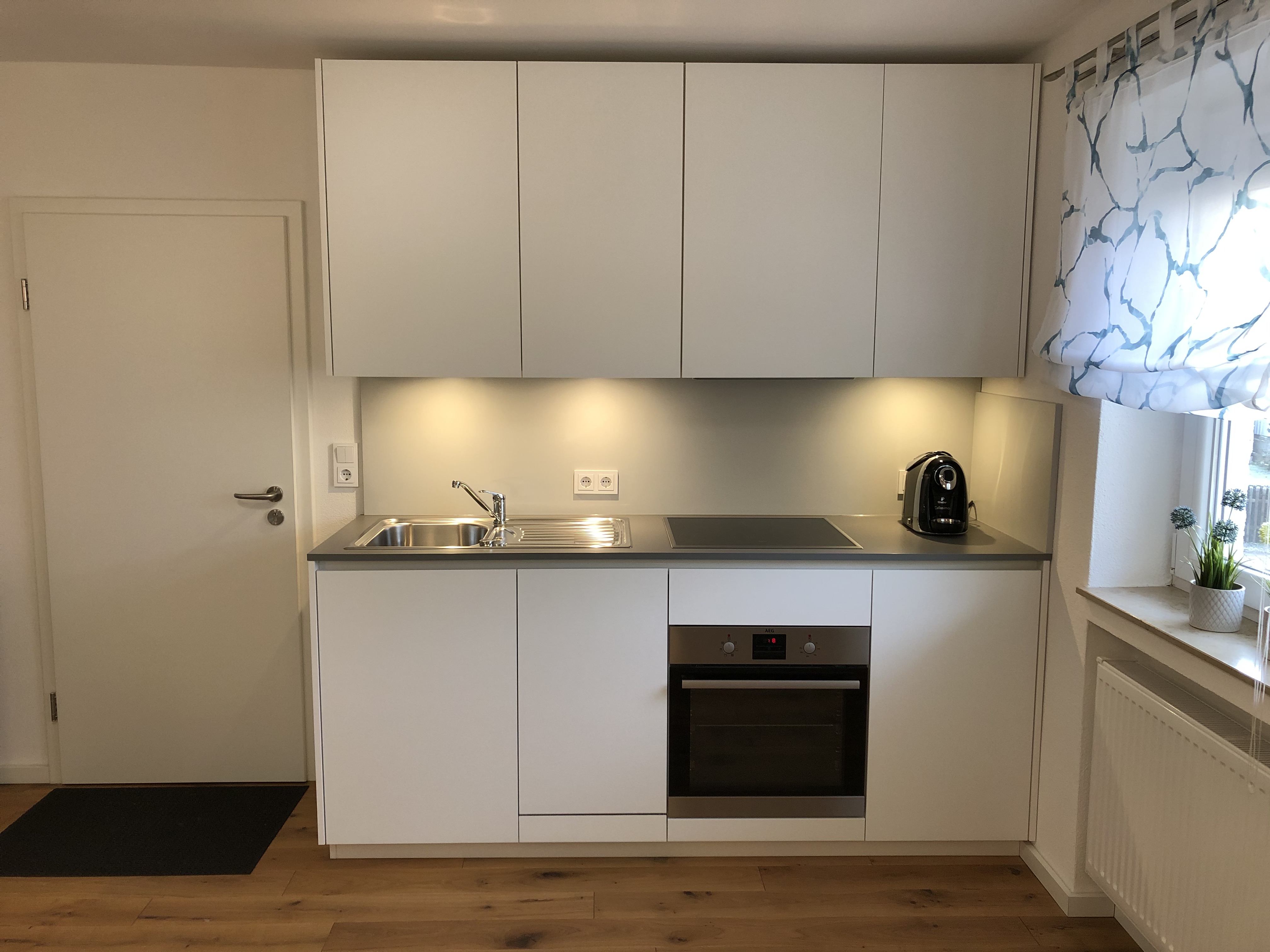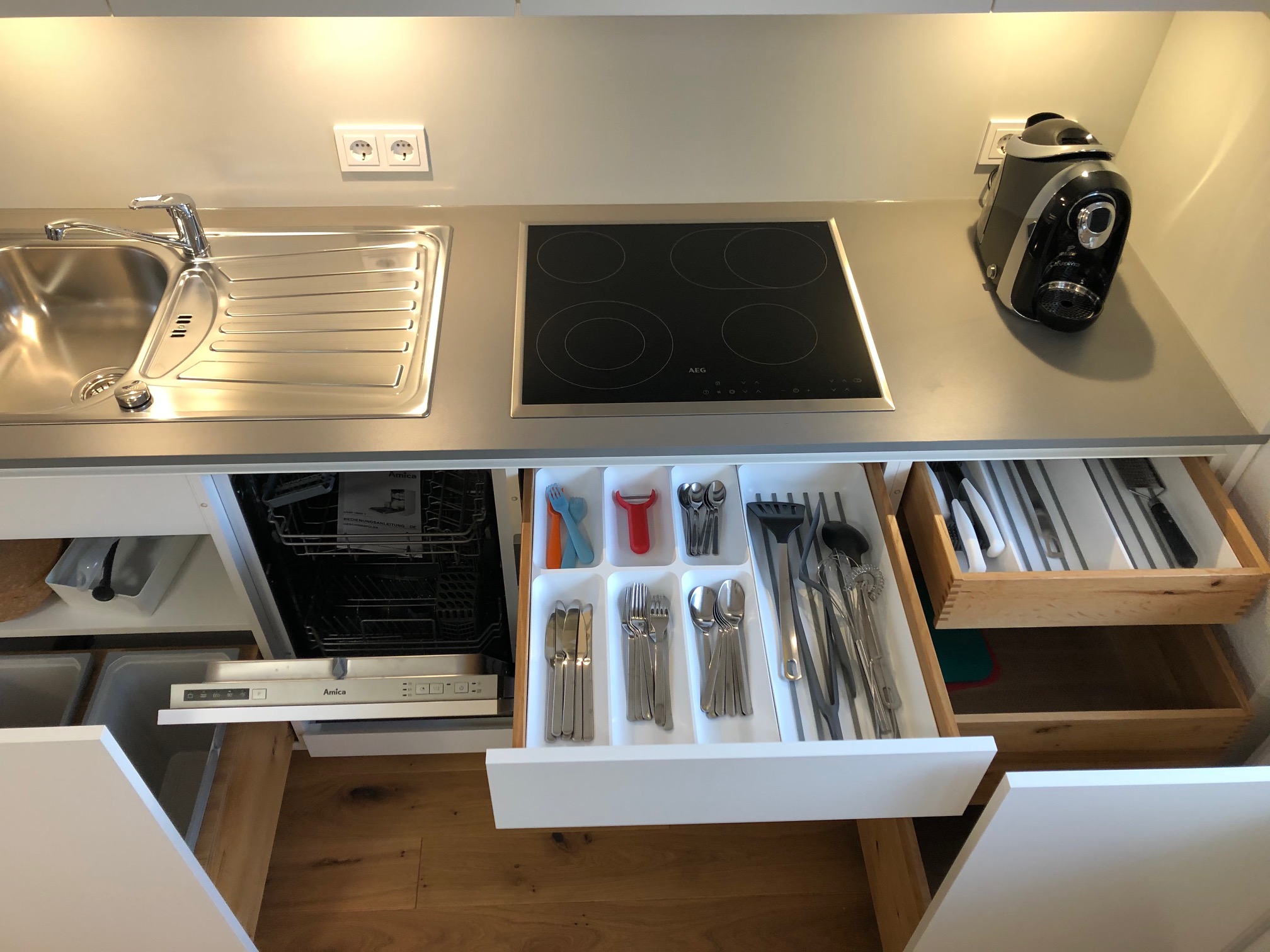 - gut ausgestattete Küchenzeile mit Backofen, Kochfeld, Dunstabzug, Spülmaschine, Kaffeemaschine, Kühlschrank, Geschirr, Töpfe, Besteck