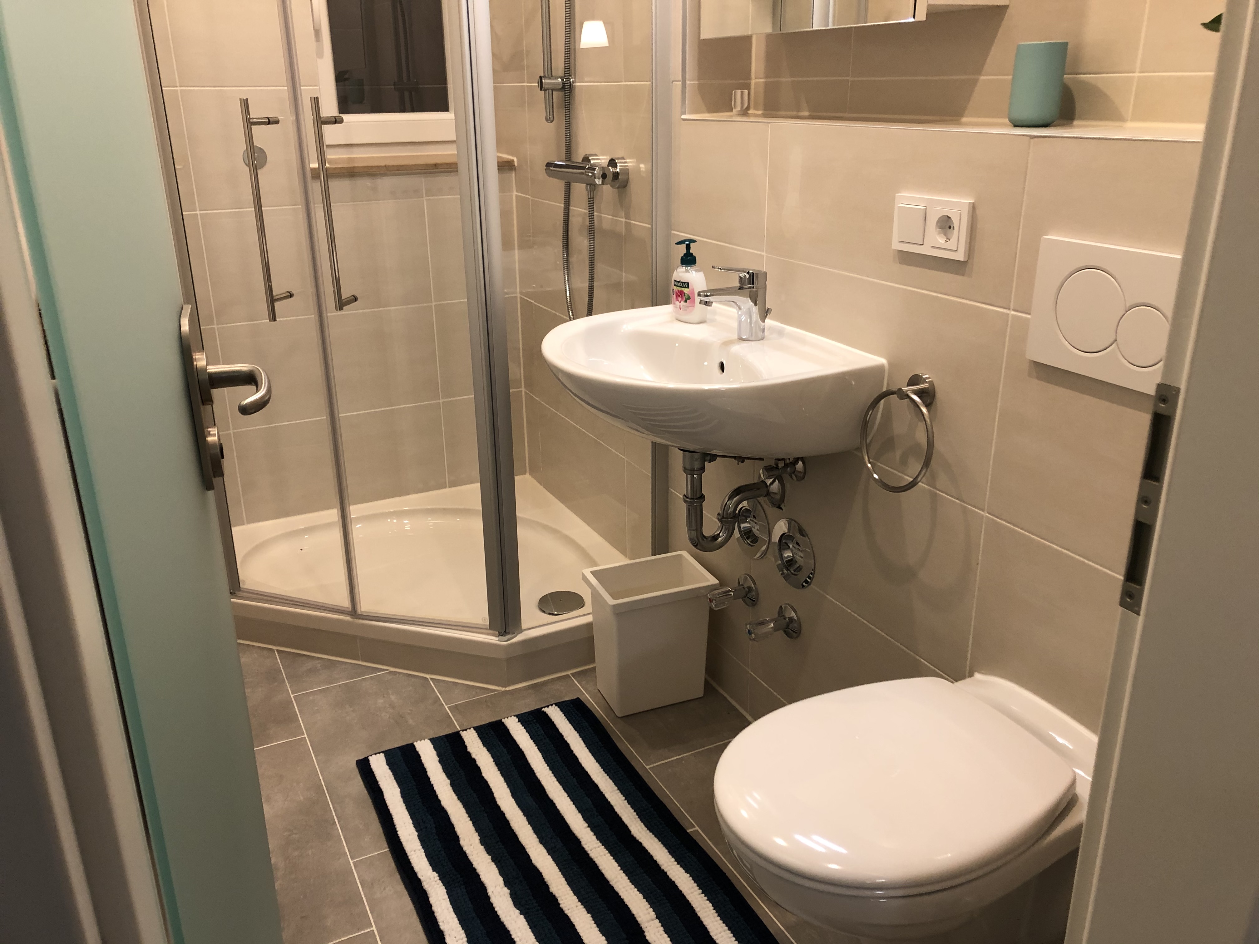Bad mit Dusche und WC, Handtuchheizkörper, Fön, Spiegelschrank