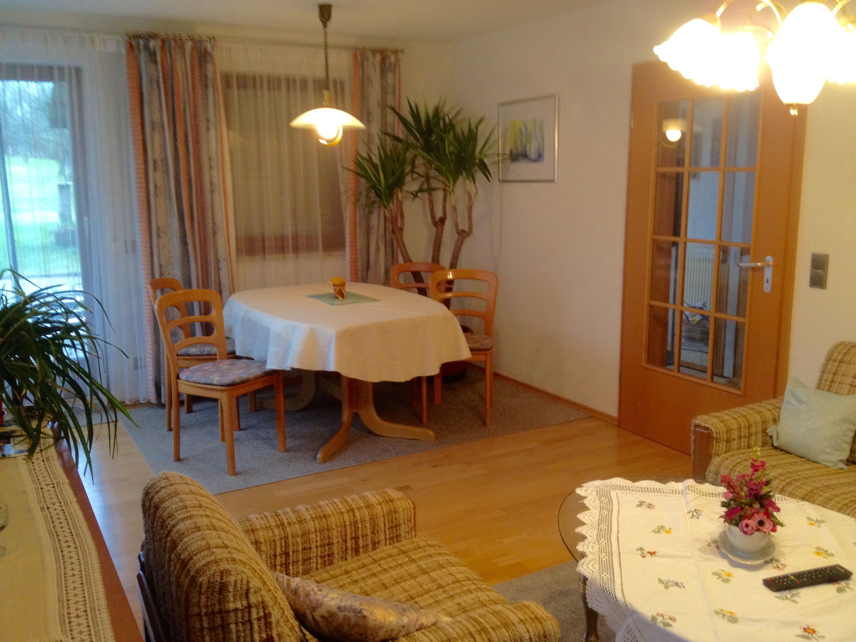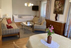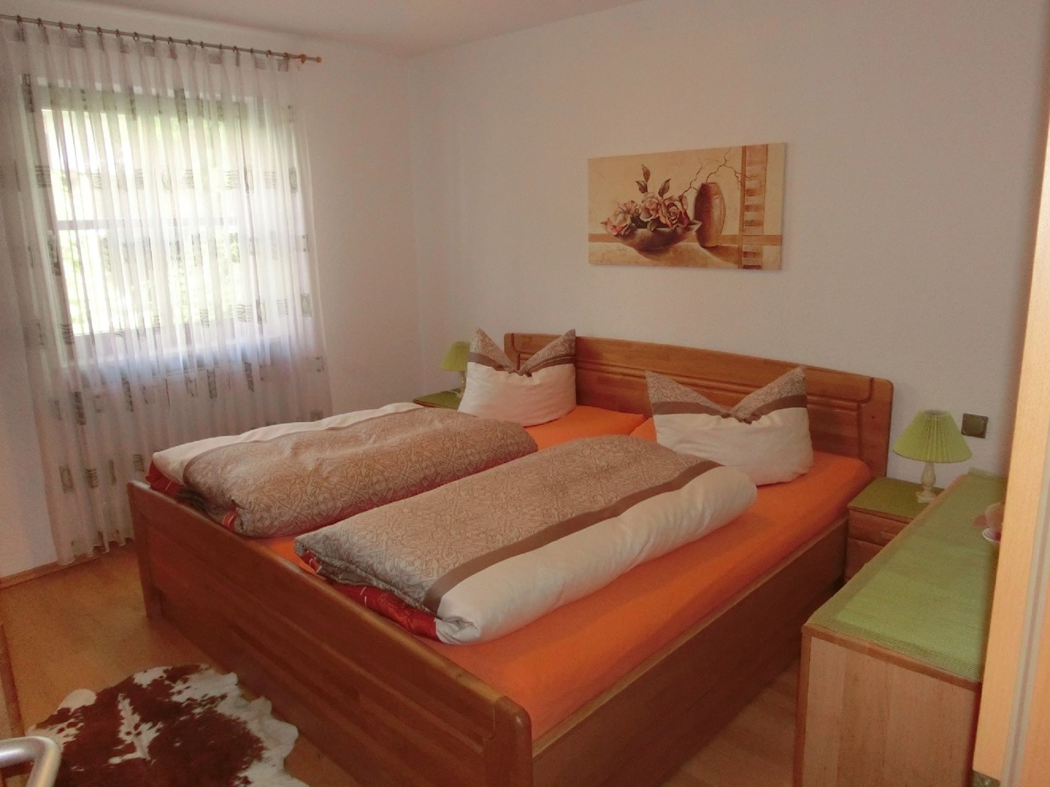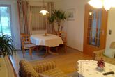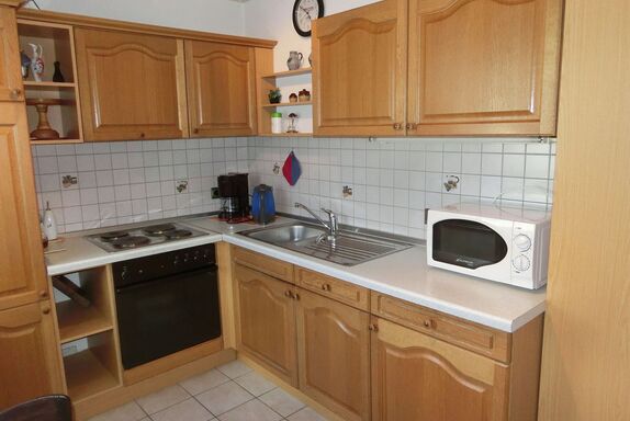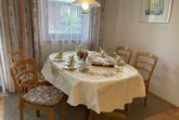 Die Ferienwohnung hat zwei Zimmer und ist insgesamt 58 Quadratmeter groß. Die Küche mit Sitzplatz für zwei Personen ist ausgestattet mit Kühlschrank, Herd, Backofen, Wasserkocher, Kaffeemaschine, Mixer, Mikrowelle, Toaster und Staubsauger. Im Wohnraum befindet sich ein Esstisch mit vier Stühlen, ein Sofa, zwei Sessel, ein Glastisch, ein Anrichte mit Zeitungen, Büchern und Spielen, Fernseher und ein Bett (90 x 200 cm) mit Bettkasten. Im Schlafzimmer finden Sie einen fünftürigen Schrank mit Spiegeltür, einen Kleiderständer, Doppelbett (200 x 200cm) und eine Kommode vor. Die Wohnung hat ein separates WC. Im Bad ist eine Dusche, Badewanne, Waschbecken mit Spiegel, Hocker und ein Handtuchhalter. Im Flur finden Sie eine Garderobe mit einem Ganzkörperspiegel. Das Highlight der Wohnung ist die Terrasse mit zwei Stühlen, einer Bank, einem Tisch, wo Sie Ihre Abende ausklingen lassen können. Im Sommer stehen für Sie zwei Relax Liegen mit einem Beistelltisch bereit. Für die Kleinen ist eine Kinderschaukel im Garten vorhanden. Auf Wunsch können wir Ihnen ein Kinderreisebett mit Bettwäsche zur Verfügung stellen.