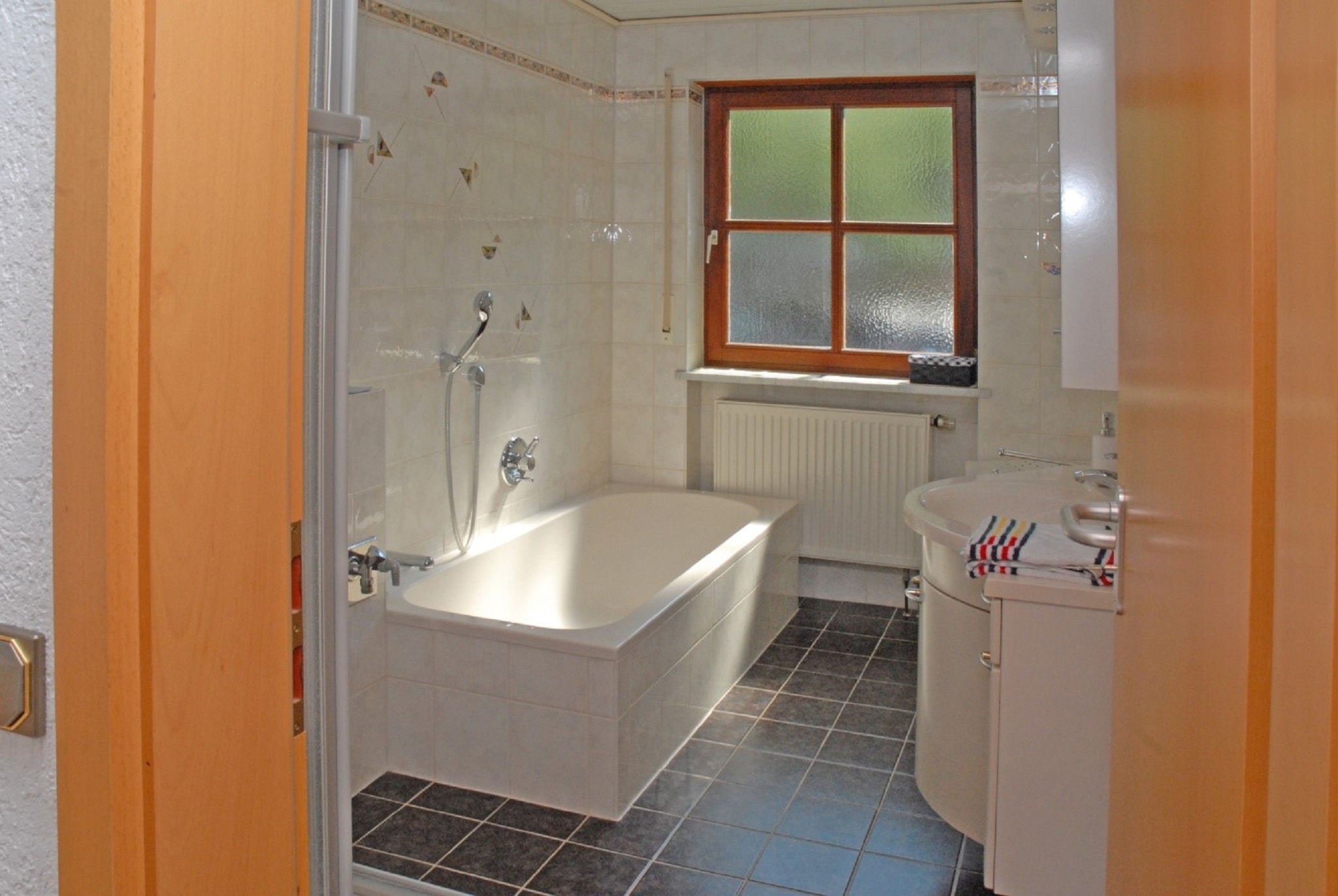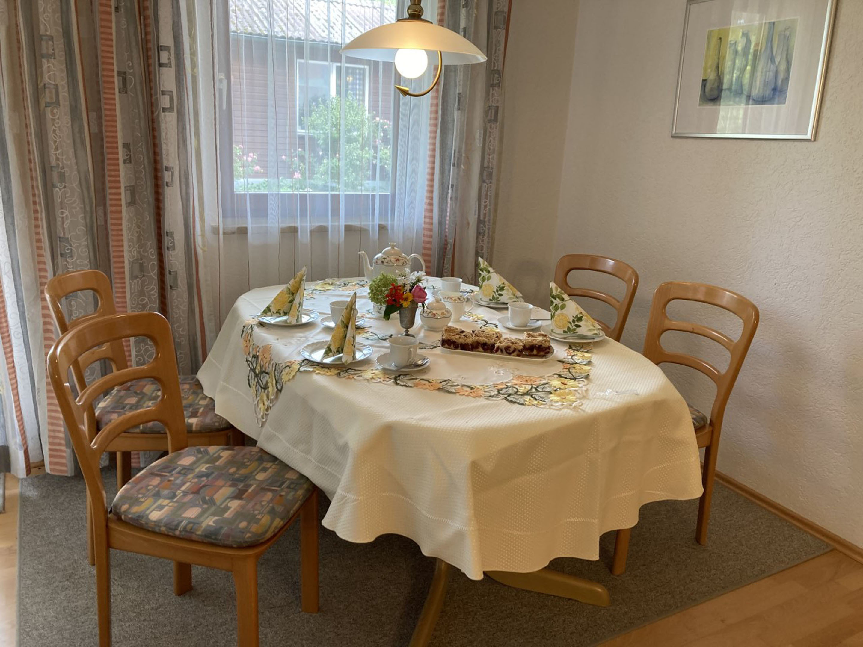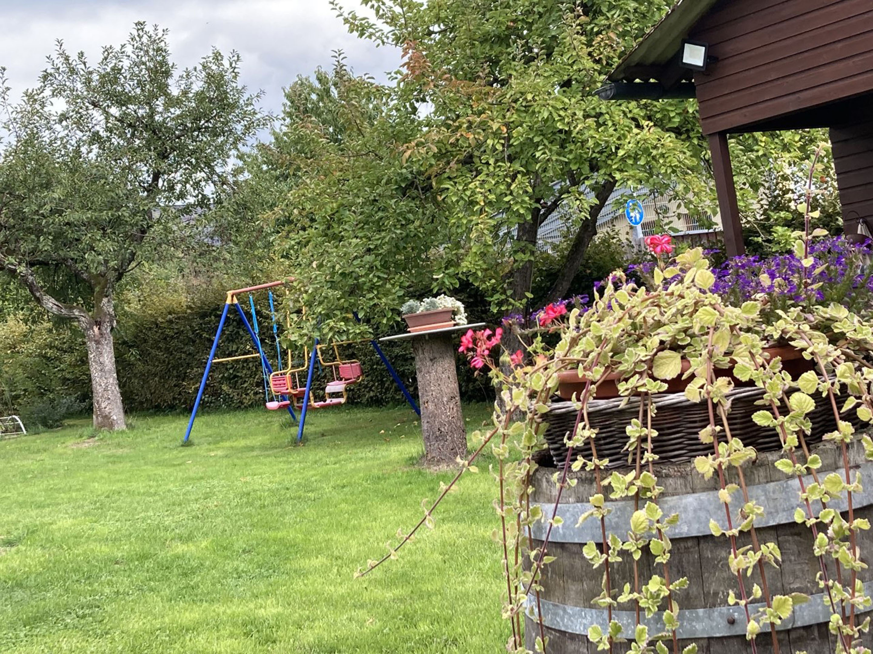 Die Ferienwohnung hat zwei Zimmer und ist insgesamt 58 Quadratmeter groß. Die Küche mit Sitzplatz für zwei Personen ist ausgestattet mit Kühlschrank, Herd, Backofen, Wasserkocher, Kaffeemaschine, Mixer, Mikrowelle, Toaster und Staubsauger. Im Wohnraum befindet sich ein Esstisch mit vier Stühlen, ein Sofa, zwei Sessel, ein Glastisch, ein Anrichte mit Zeitungen, Büchern und Spielen, Fernseher und ein Bett (90 x 200 cm) mit Bettkasten. Im Schlafzimmer finden Sie einen fünftürigen Schrank mit Spiegeltür, einen Kleiderständer, Doppelbett (200 x 200cm) und eine Kommode vor. Die Wohnung hat ein separates WC. Im Bad ist eine Dusche, Badewanne, Waschbecken mit Spiegel, Hocker und ein Handtuchhalter. Im Flur finden Sie eine Garderobe mit einem Ganzkörperspiegel. Das Highlight der Wohnung ist die Terrasse mit zwei Stühlen, einer Bank, einem Tisch, wo Sie Ihre Abende ausklingen lassen können. Im Sommer stehen für Sie zwei Relax Liegen mit einem Beistelltisch bereit. Für die Kleinen ist eine Kinderschaukel im Garten vorhanden. Auf Wunsch können wir Ihnen ein Kinderreisebett mit Bettwäsche zur Verfügung stellen.