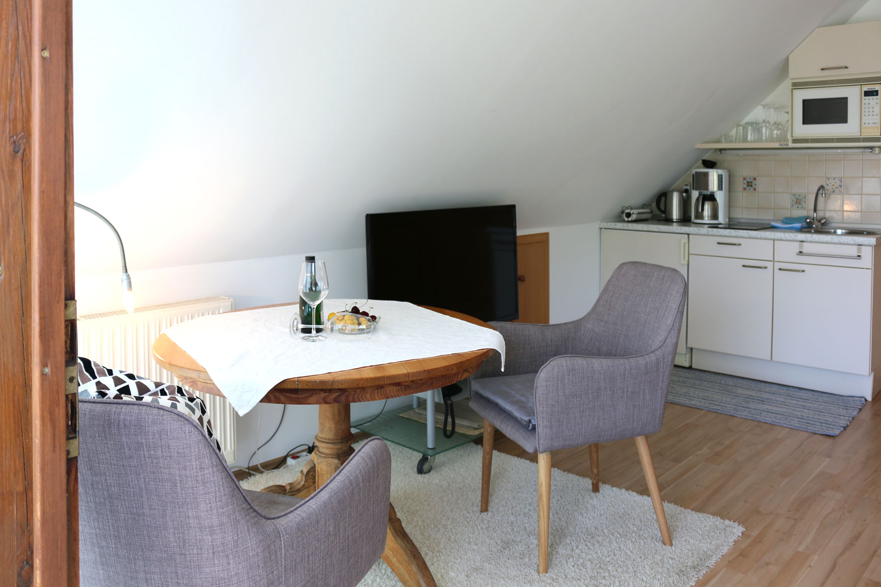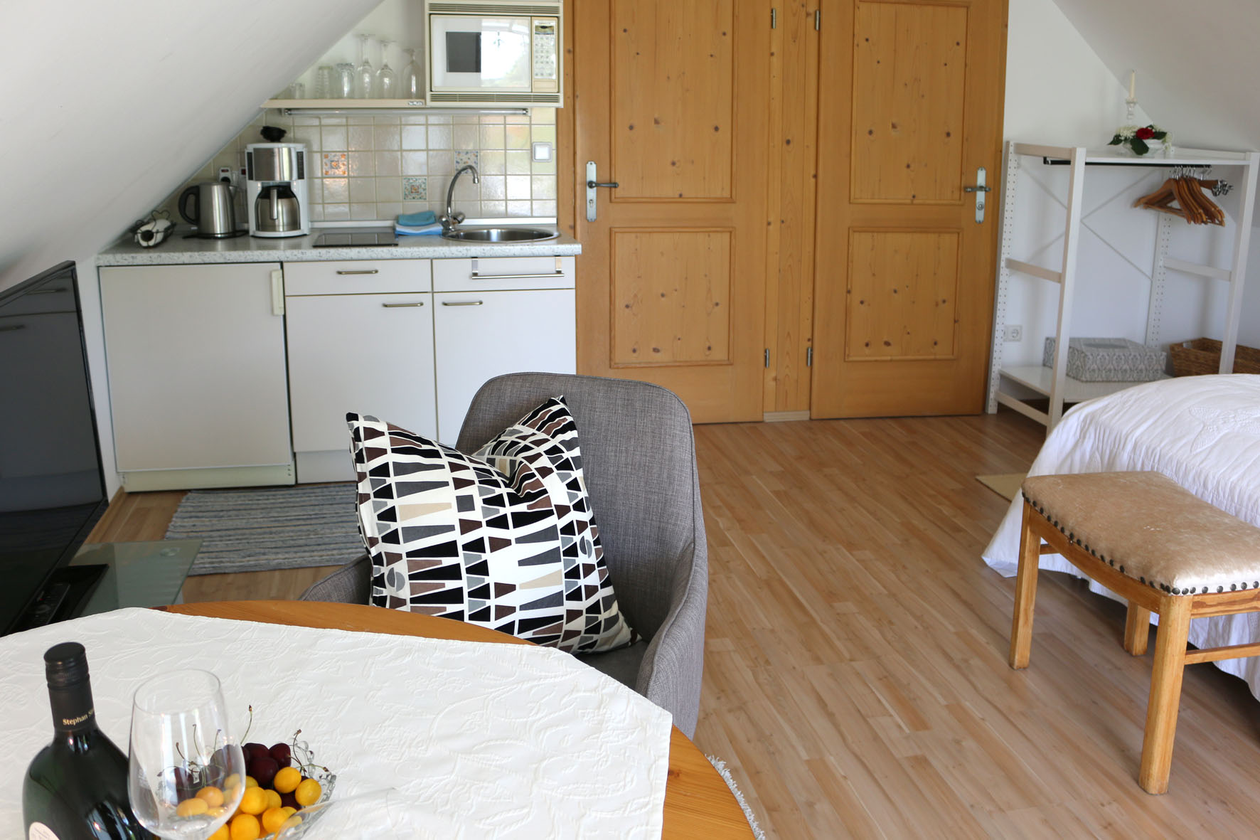 Unsere kleine aber feine Wohnung Libelle ist charmant und liebevoll eingerichtet. Im bequemen französischen Doppelbett kann man wunderbar den Ausblick in die Weinlaube genießen. Der kleine romantische Balkon ist der perfekt Ort, um mit dem einen oder anderen Glas Wein zu verweilen.