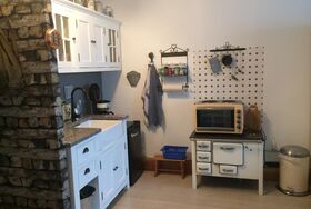 Küchenzeile mit Geschirr, Kaffeemaschine, Eierkocher, Toaster, Backofen, 2 Herdplatten.