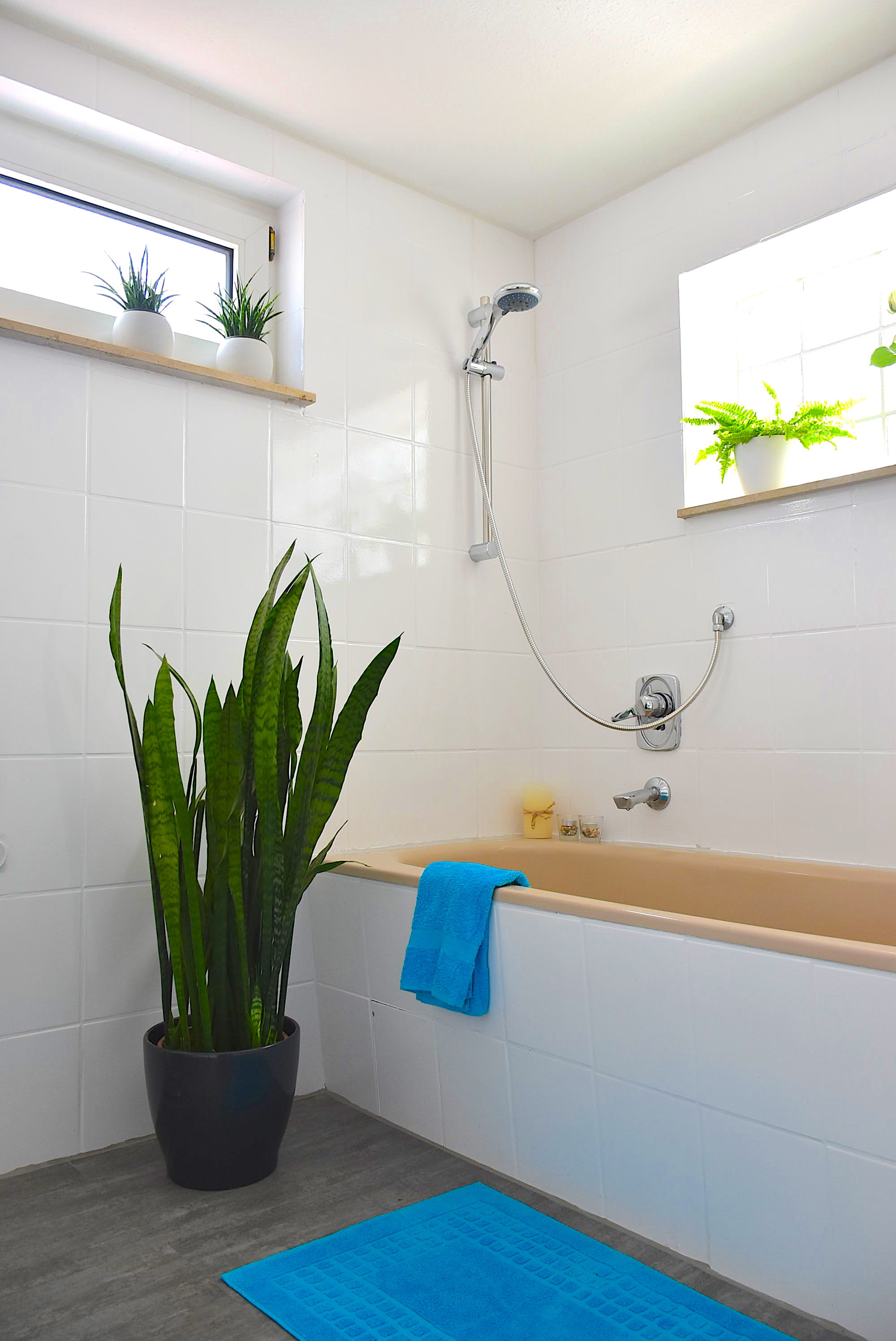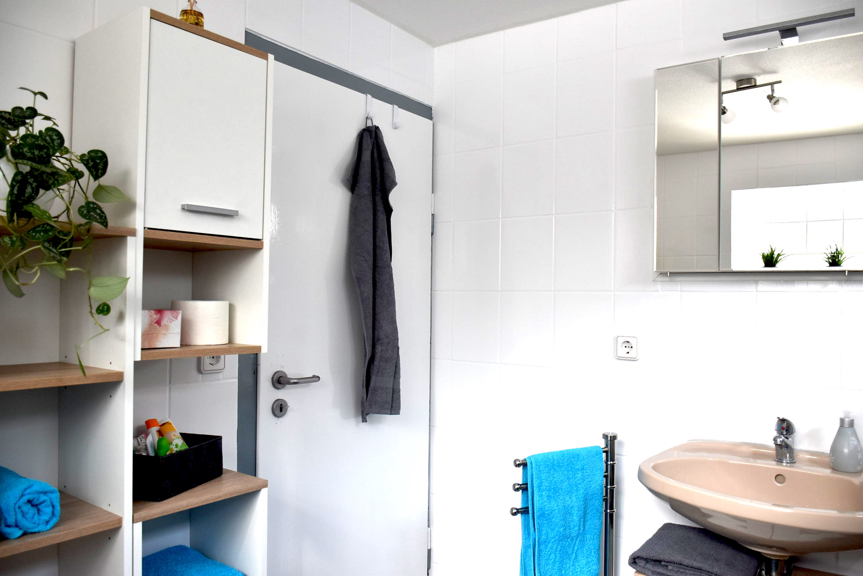 mit Badewanne, auch zum Duschen geeignet, WC, Waschbecken, Spiegelschrank, Fön, Badschränke mit Handtücher