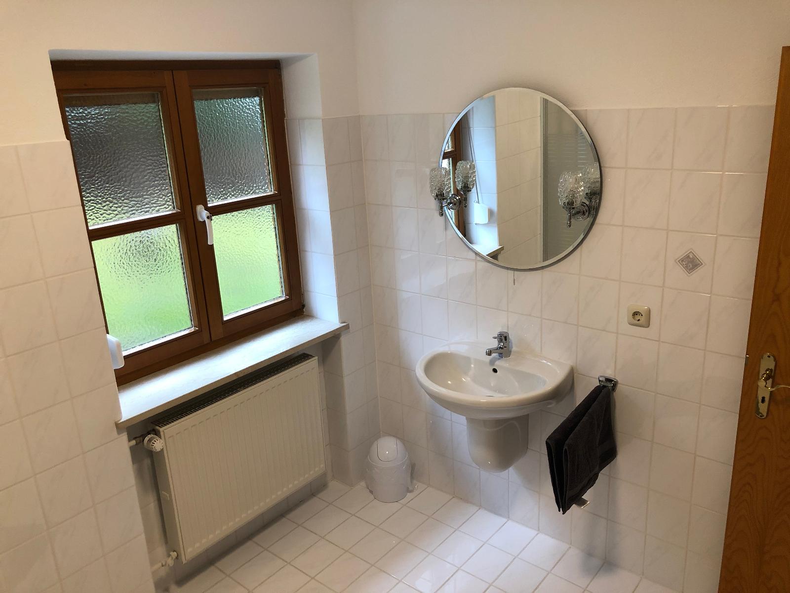 Das Tageslicht Bad verfügt über ein Waschbecken mit Spiegel und Beleuchtung, eine Toilette, Dusche, Mülleimer, Fön, und eine Ablagemöglichkeit für Ihre Hygieneartikel.
