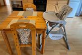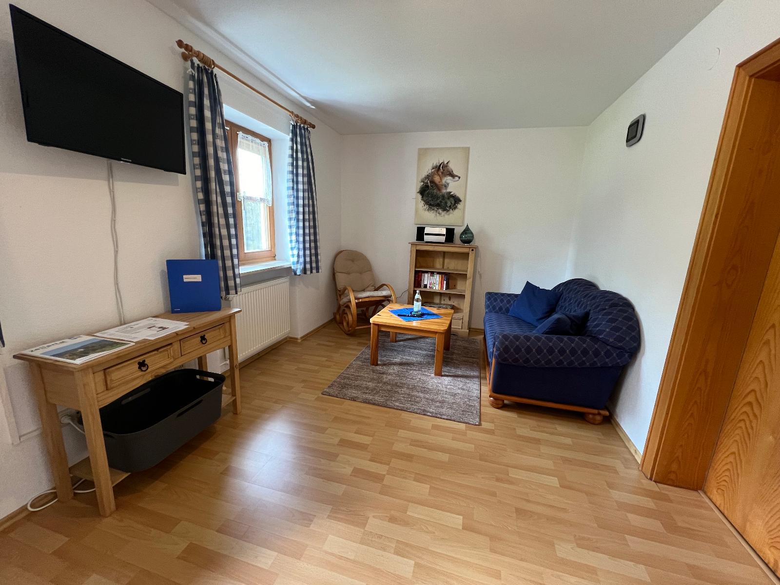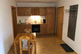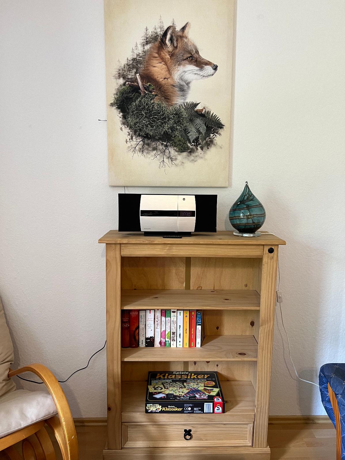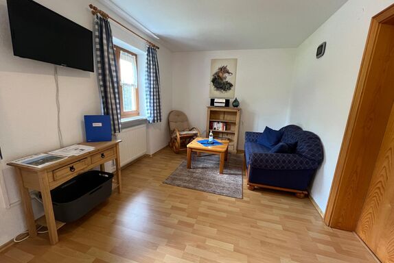 Der Wohn- und Essbereich ist ausgestattet mit einer 2 Sitzer-Couch, mit Schaukelstuhl und Tisch, Garderobe mit Schuhwanne, einem Flat-TV mit Sat Anschluss, einer CD-Radio Mini Anlage, Kostenlosem W-LAN, einem Ausziehtisch mit 2 Stühlen, einer Küchenzeile mit 4 Platten Herd, Backofen, Kühlschrank, Kaffeemaschine, Toaster, Wasserkocher, Pfannen, Töpfe, Geschirr und Besteck.
