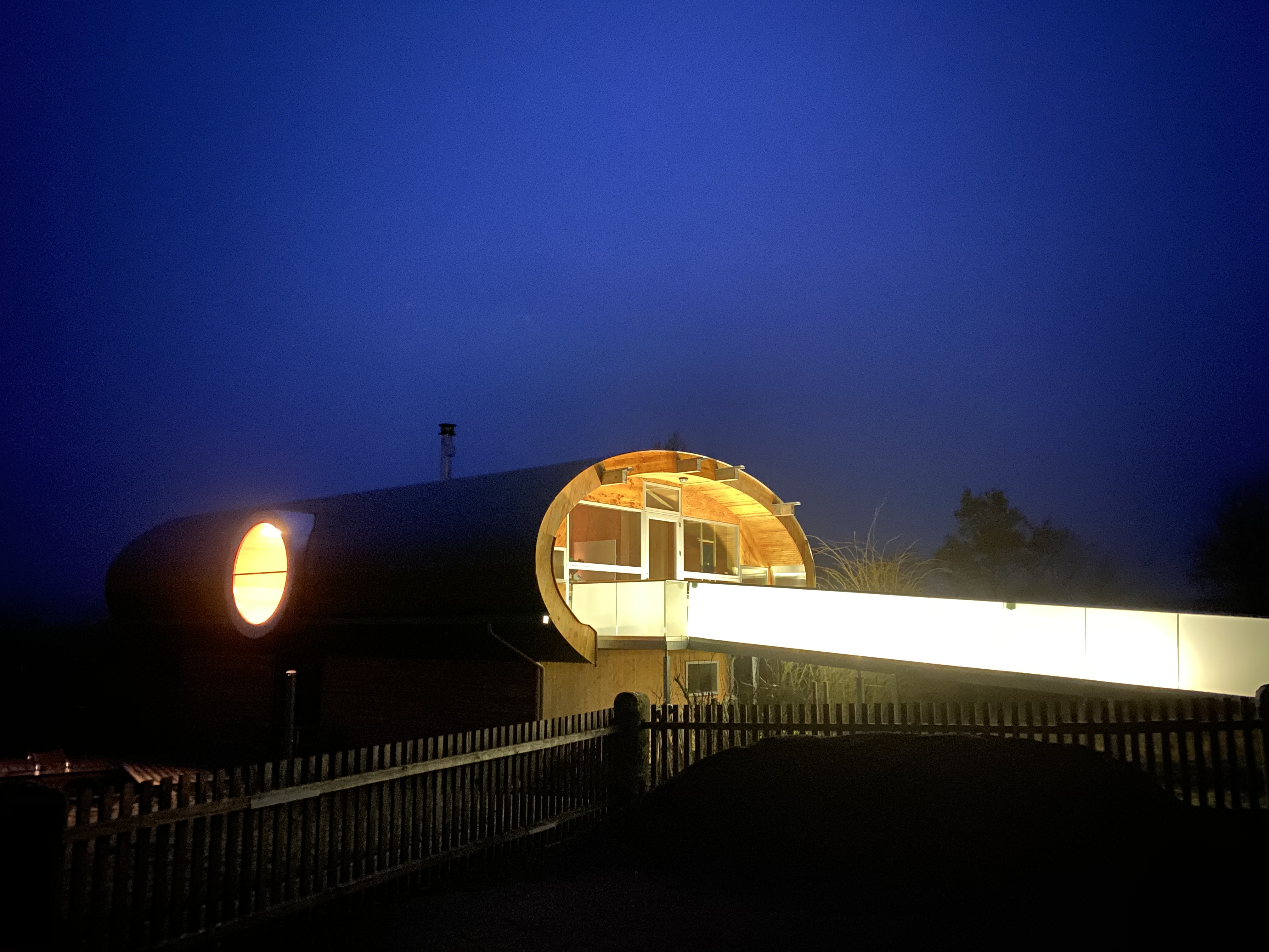 UFO47 – das Holzhaus vom Schreiner. Dieses Ungewöhnliche Ferienhaus Objekt findest du nur einmal auf der Welt, hier in den Haßbergen. Ganz ruhig gelegen mitten im Naturpark, direkt am historischen Rennweg. Das nachhaltig und ökologisch aus Holz, Glas und Metall gebaute Haus verzichtet wo immer möglich auf Kunststoffe und setzt auf nachhaltige, natürliche Materialien für ganz besonders umweltfreundliches und gesundes Wohnen. Mit vielen exklusiven Extras, die Deine Zeit im UFO47 zu etwas besonderem machen: Zum Beispiel die überlangen Boxspringbetten, eingebaut in die heimelige runde Gebäudeform, die Dich besonders geborgen fühlen lassen... Schöner Garten direkt angrenzend mit Nutzungsmöglichkeit des Schwimmteich-Biotops.