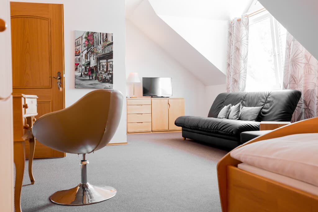 Unsere Ferienappartements sind ca. 60 qm groß und beinhalten ein Badezimmer mit Dusche und WC, Wohnraum mit Fernseher und Schlafcouch, Küchenzeile inkl. Kühl- und Gefrierschrank, Kaffeemaschine und Wasserkocher, sowie ein Schlafzimmer mit Doppelbett. Im Preis enthalten sind SAT-TV und W-LAN sowie Parkplätze und eine Fahrradgarage.