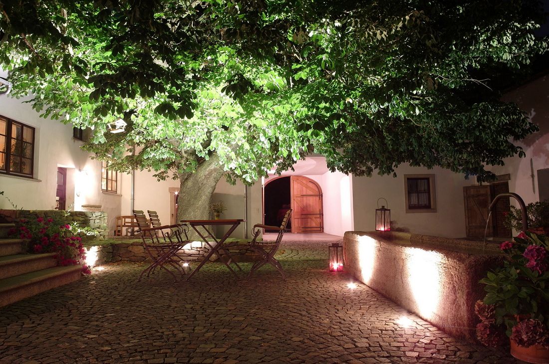 Der historische Innenhof mit den großen Bäumen und dem alten Brunnen, aus dem seit 1799 frisches Quellwasser sprudelt, hat mediterranen Flair und ist der ideale Platz zum Genießen, Entspannen, Frühstücken oder für ein Gläschen Bier / Wein am Abend.