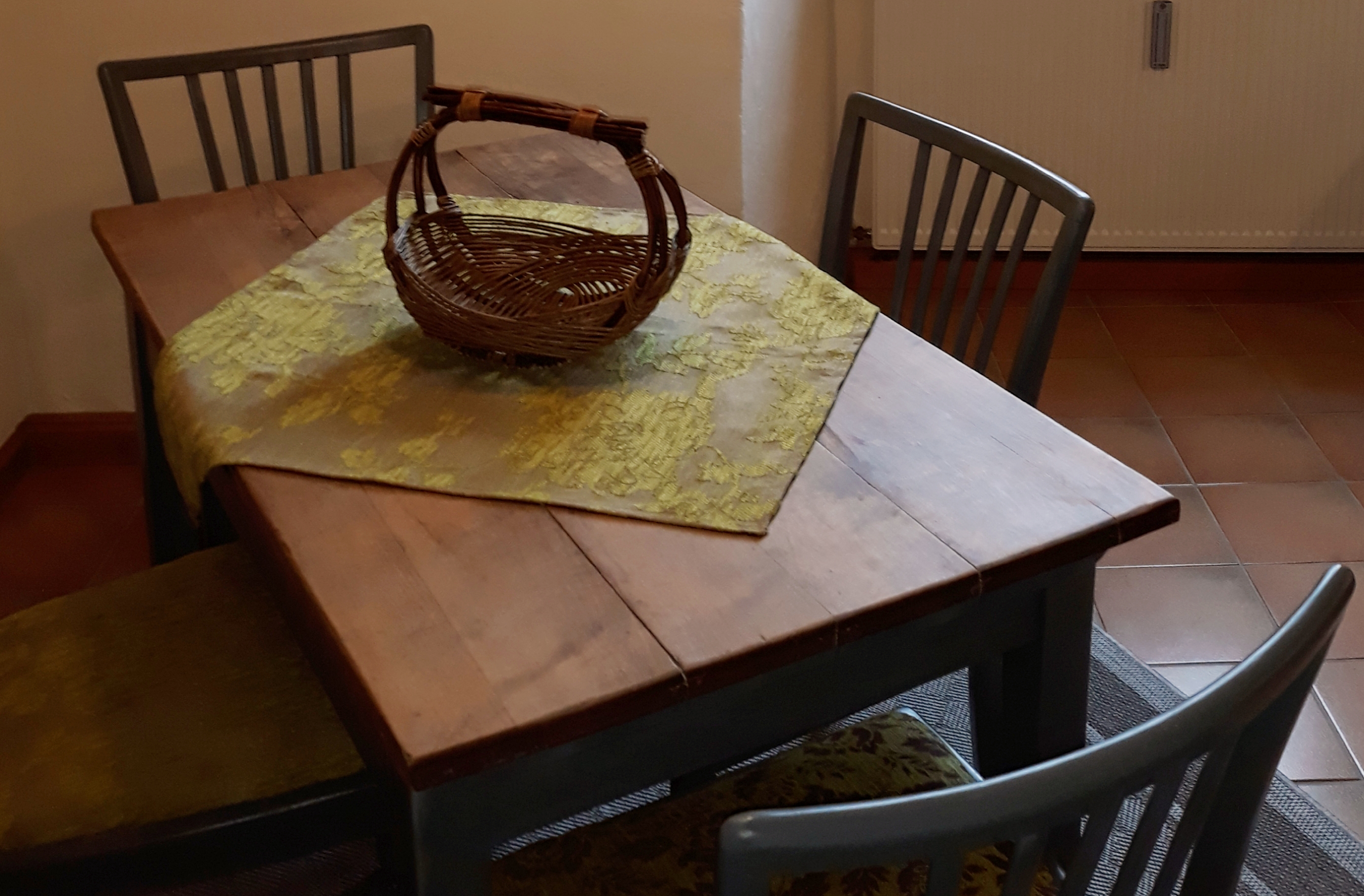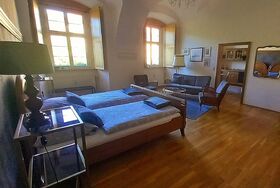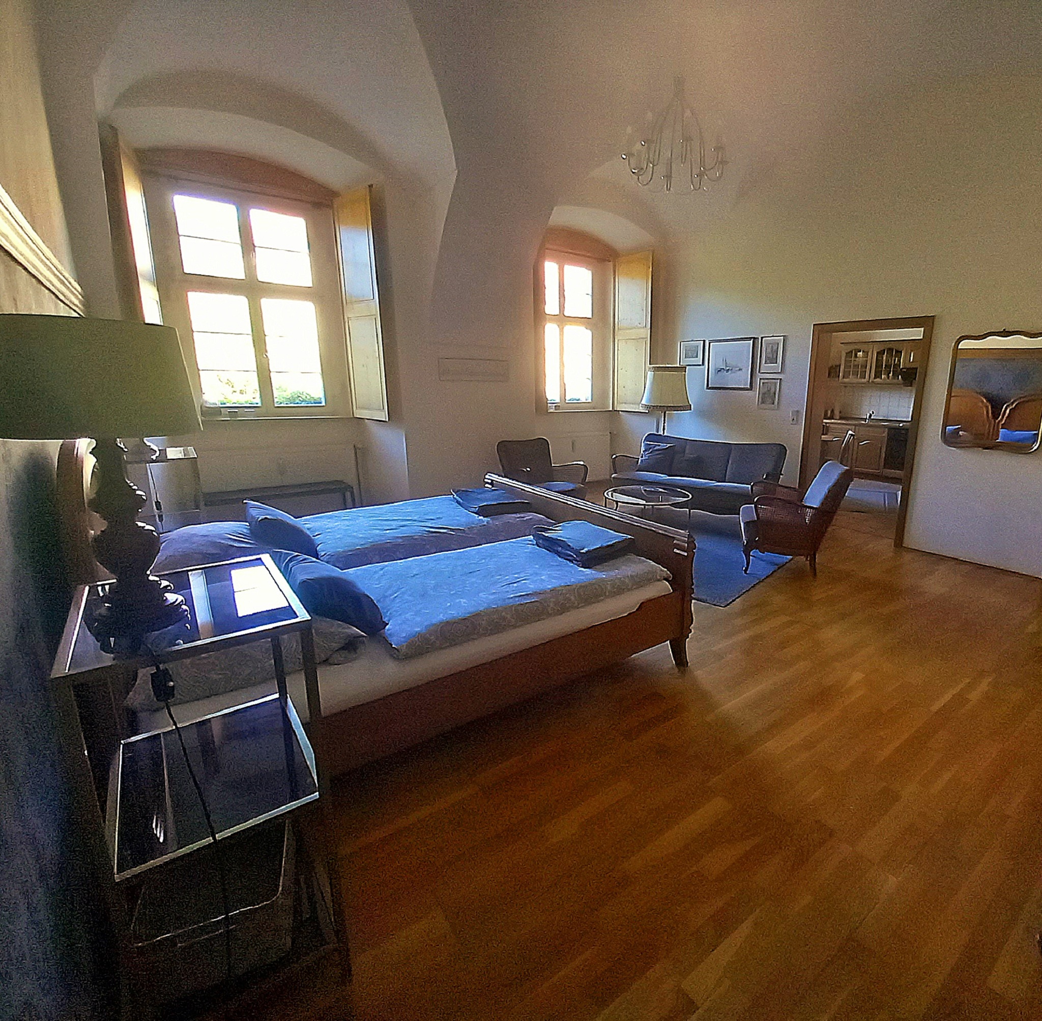 Unser geräumiges Appartement mit 52qm Wohnfläche bietet Platz für bis zu drei Personen. Der gemütliche Wohn- Schlafraum mit zwei ausklappbaren, getrennten Betten und einer zusätzlichen Ausziehcouch lädt zum Verweilen ein. Die komplett ausgestattete Küche mit Esstisch, Geschirrspüler, Kaffeemaschine, Kühlschrank und Toaster lässt keine Wünsche offen. Das Badezimmer mit Dusche, Wanne und WC rundet das Gesamtbild ab. Genießen Sie die Aussicht auf die historischen Klostergebäude, den Garten oder die Parkanlage samt Brunnen in der Dorfmitte. Sie können die verschiedenen Freisitze des 3.500 m2 großen Gartens zum Verweilen oder Grillen nutzen.