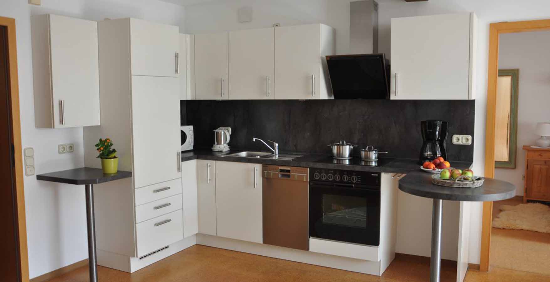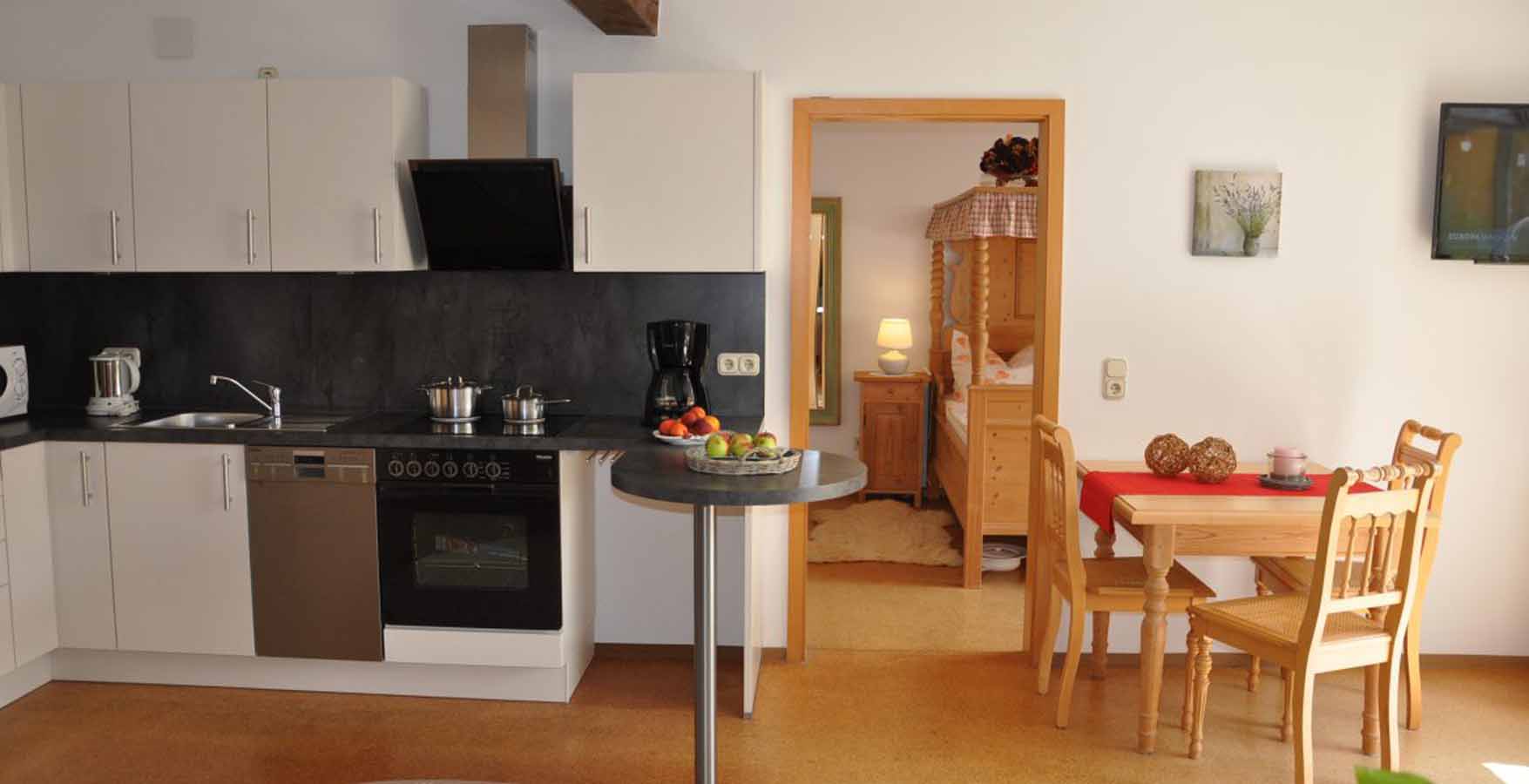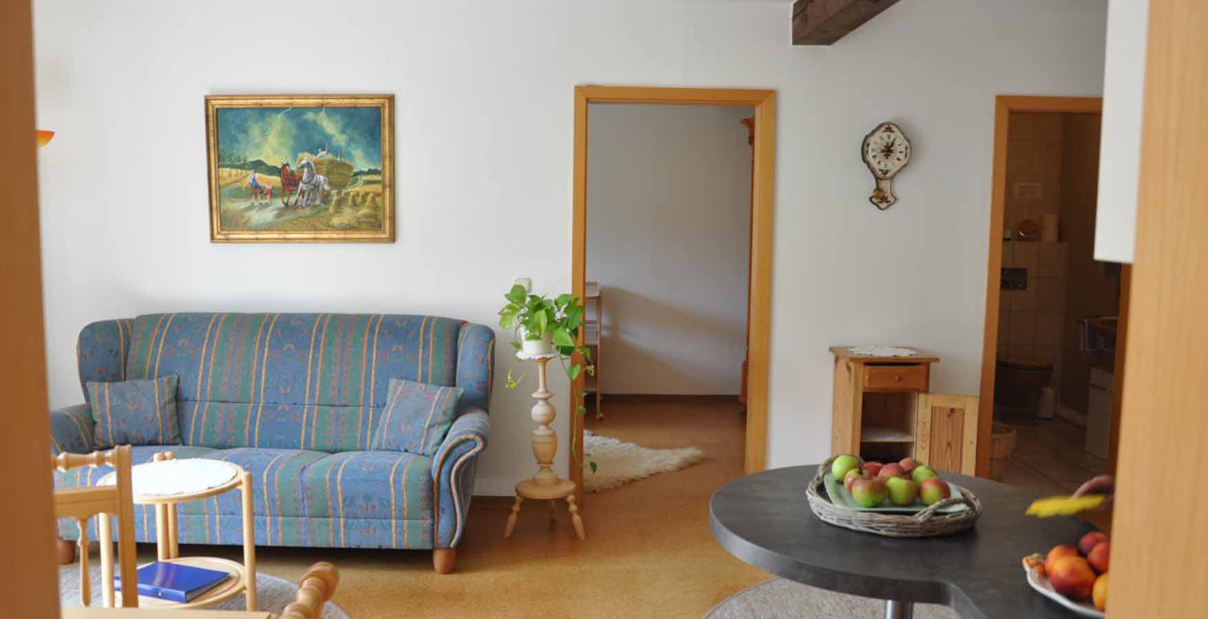 Die Ferienwohnung ist mit den fränkischen Originalen nachempfundenen Möbeln ausgestattet, deren Vorbilder im Fränkischen Freilandmuseum in Bad Windsheim zu sehen sind. Diese naturbelassene, mit Bienenwachs eingelassene Ausstattung ist besonders für Allergiker geeignet.