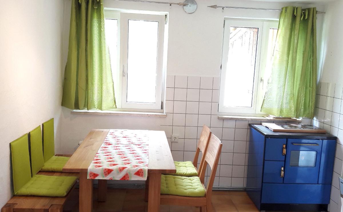 Küche mit Essbereich, Kühlschrank, Geschirrspülmaschine, Kaffemaschine,
