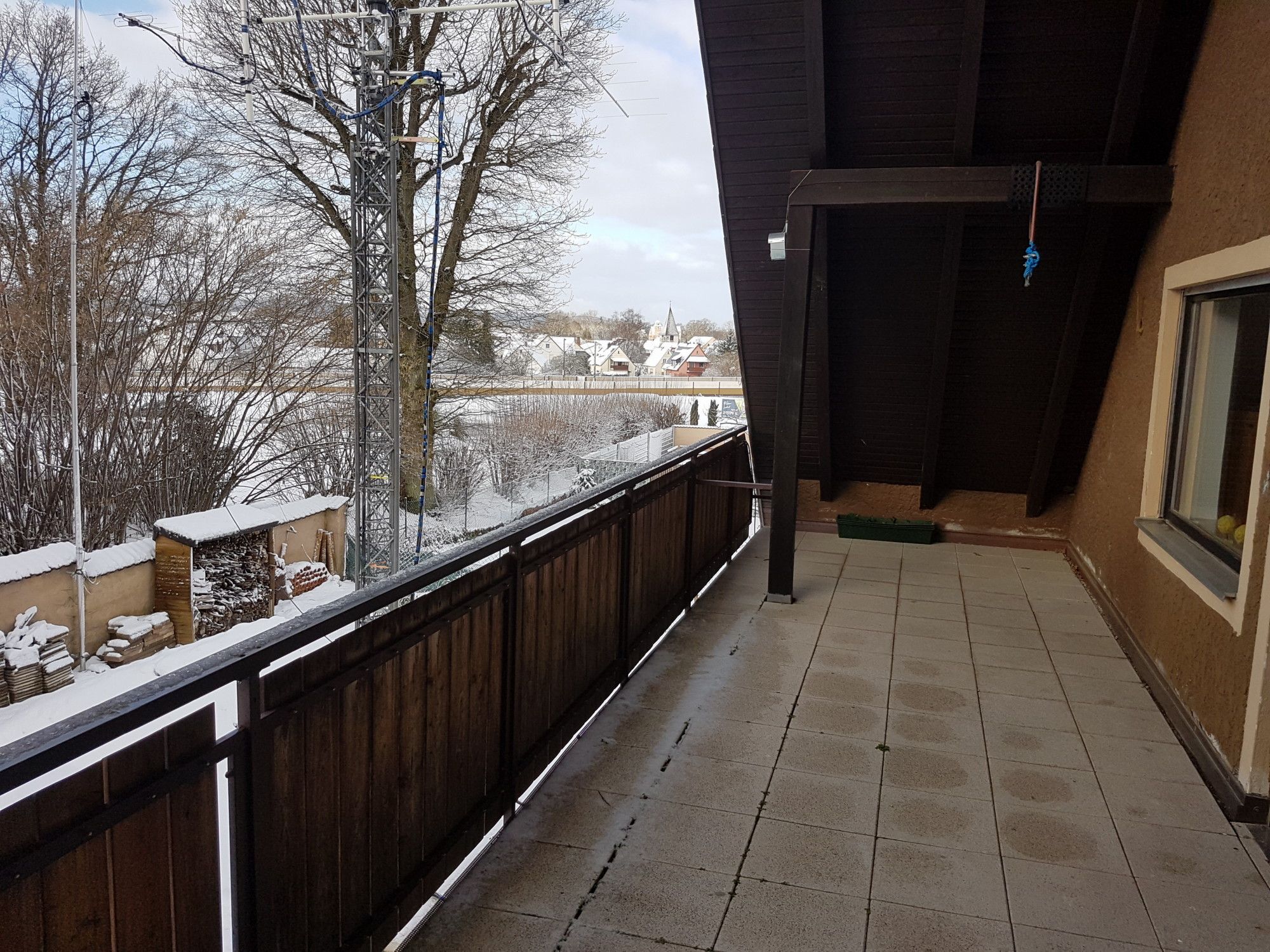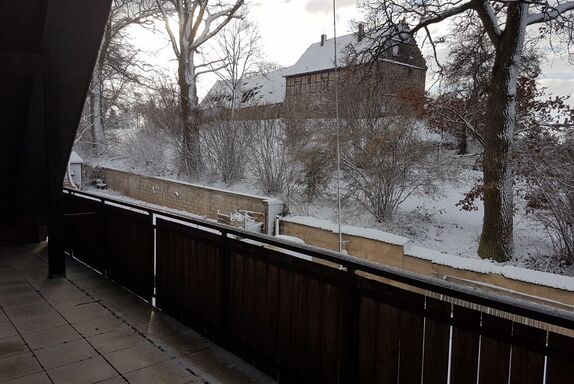 Großer überdachter Balkon mit Blick auf die Grünanlagen des benachbarten „Witwenschlösschens“.