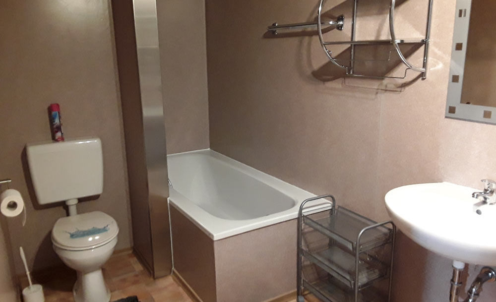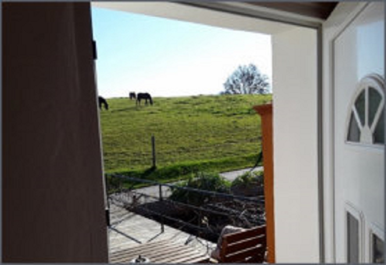Das Apartment hat einen direkten Zugang zur Sonnenterasse mit Blick auf die Pferdekoppel und unseren Hausberg. Es verfügt über eine kleine Teeküche mit Kühlschrank, ein gemütliches Schlafzimmer, ein neu renoviertes Bad mit WC und Dusch/Badewanne. Ideal für Leute, die sich gerne selbst versorgen und bei Sonnenaufgang auf der Terrasse ihren Kaffee genießen wollen.