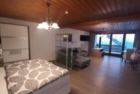 Großes 1 Zimmer Appartement (ca. 45m²) mit West-Balkon mit Blick zum großen Arber sowie Bad/WC und Badewanne.