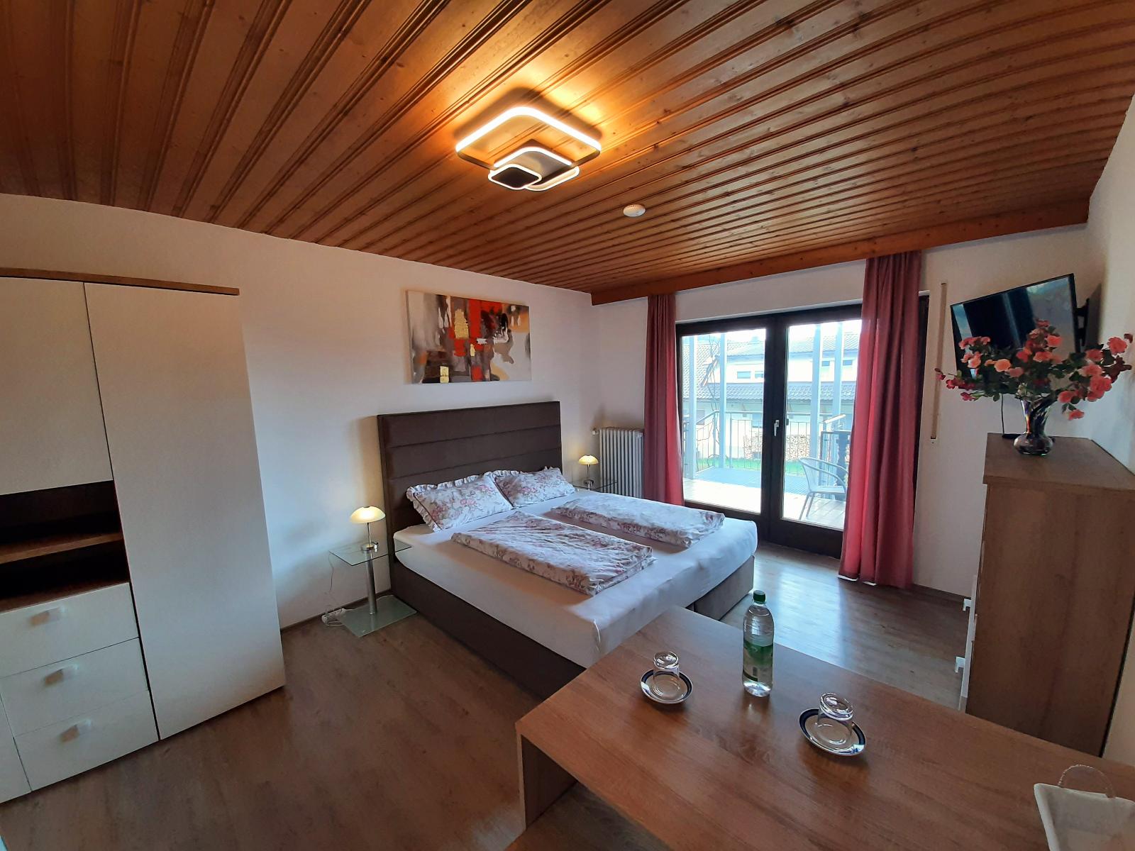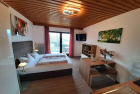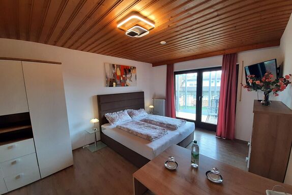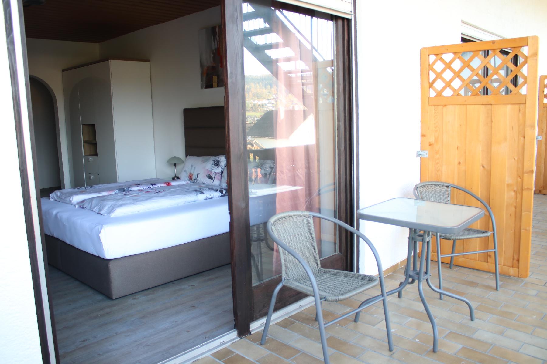 1 Zimmer Appartement EG mit sonnigen West-Balkon mit Blick zum großen Arber sowie mit barrierefreier Duche/WC.