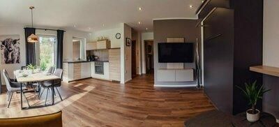 Die 60m2 teilen sich auf in einen Eingangsbereich, einem Schlafzimmer, einem Badezimmer und einem geräumigen Wohnraum. Im Wohnraum befinden sich Küche, Essbereich, Couch + Fernseher sowie ein hochwertiges Klappbett und Zugang zum Balkon.