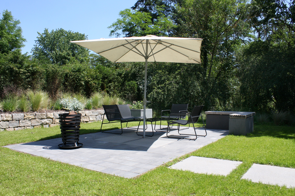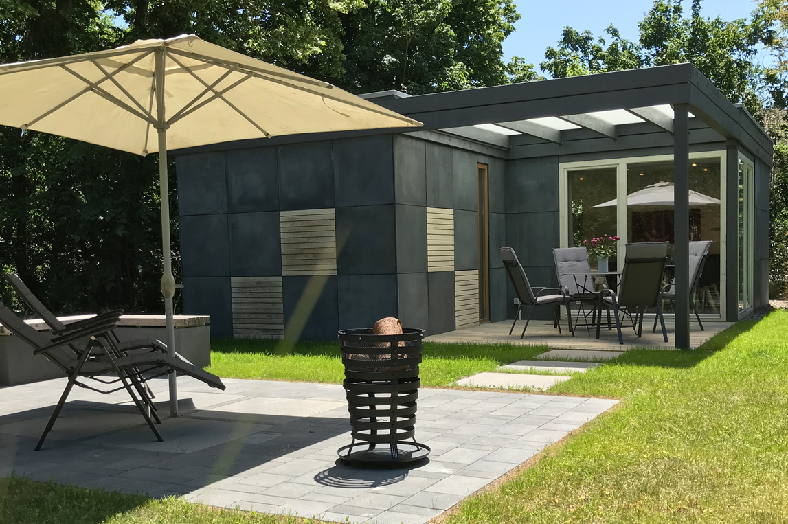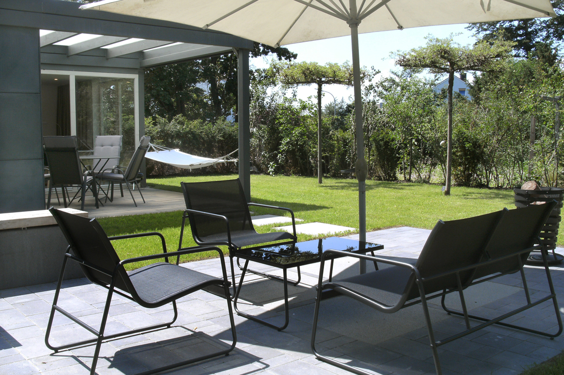 Wegen der geografischen Ausrichtung des Cube-House können Terrassen und Garten vom ersten bis zum letzten Sonnenstrahl genutzt werden.
