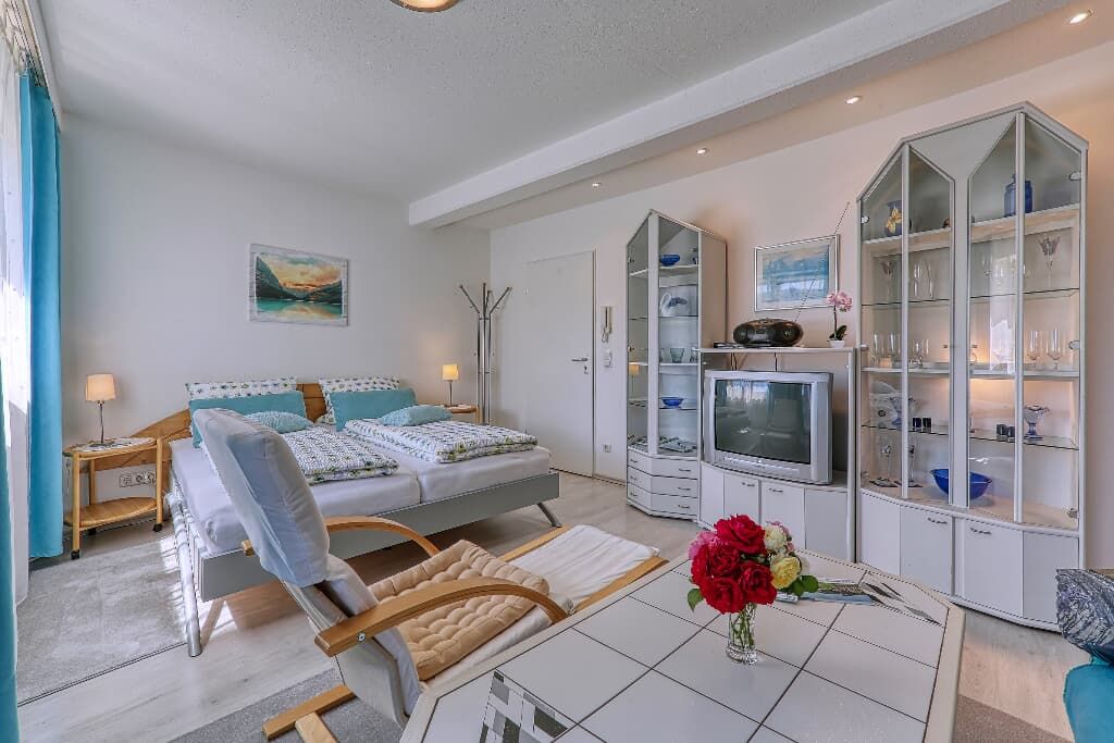 Im Vorraum befindet sich ein Schrank für Ihre Kleidung und zur Ablage für das Reisegepäck. Der kombinierte Wohn-Schlafraum ist möbliert mit Doppelbett, Couch, Sessel und Wohnwand mit SAT-TV und Radio.