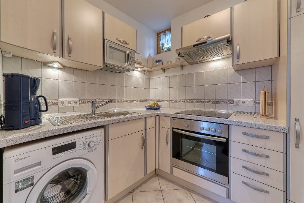 Angrenzend finden Sie die komplett eingerichtete offene Küche mit Essplatz. Die Küche ist ausgestattet mit: E-Herd mit Backofen, Mikrowelle, Kühl-Gefrierkombination, Kaffeemaschine, Wasserkocher, Eierkocher, Toaster, Geschirr, Kochutensilien sowie Küchentücher. Im Bad sind Dusche, WC und Waschbecken installiert, ein kleines Fenster ist vorhanden.
