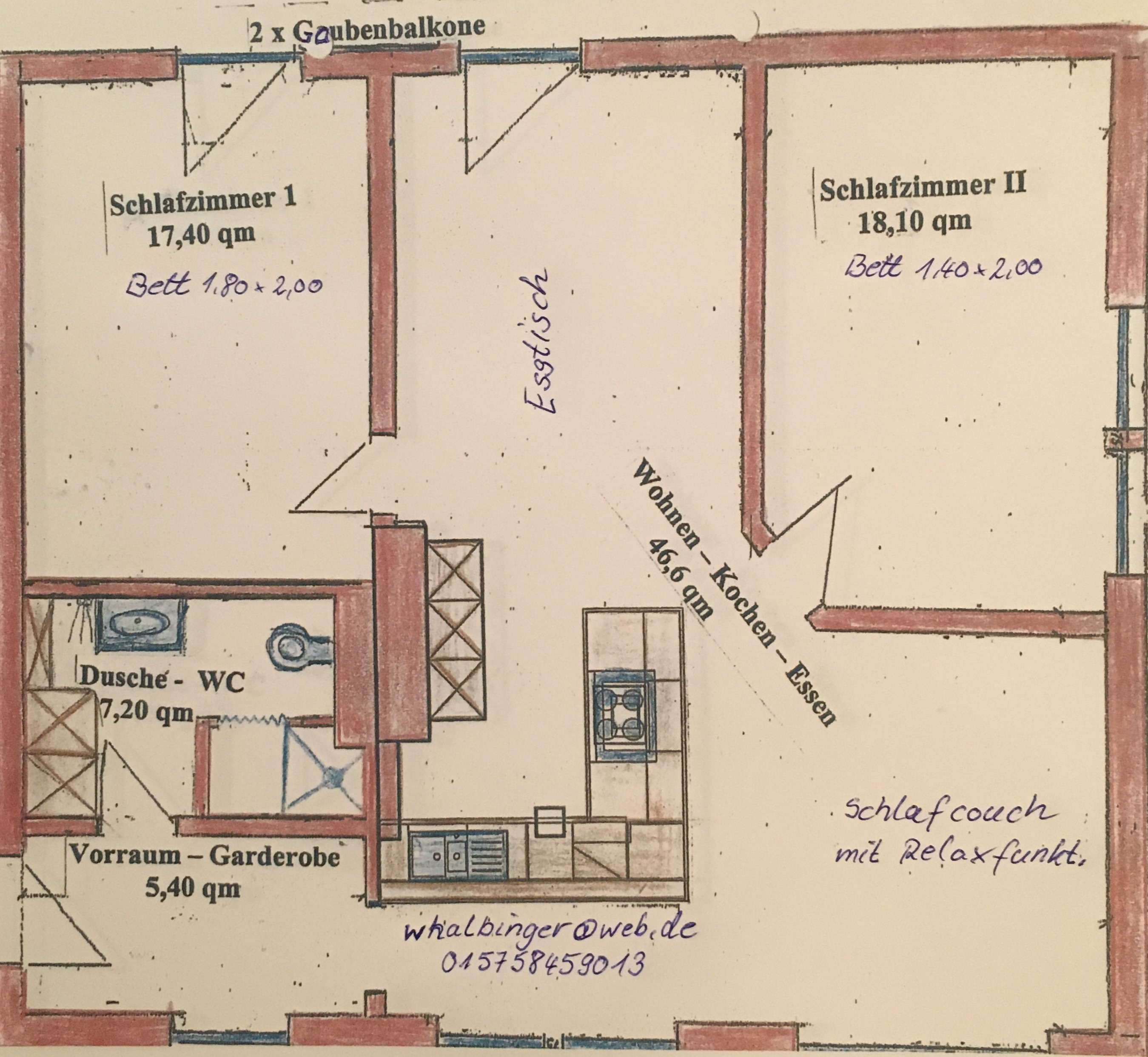 Die geräumige 3-Zimmer-Nichtraucher Wohnung mit 75 m² Wohnfläche und mit 2 Gauben Balkonen, verfügt über einem Wohnraum mit kompletter Küchenzeile/Bar, 2 Schlafzimmer mit Doppelbett (1 x 1,80 x 2, 00m und 1 x 1,40 x 2, 00m), Bad mit Dusche und WC und Diele. Die Ferienwohnung ist modern ausgestattet und für 1 bis 4 Personen vorgesehen. Die Küchenausstattung umfasst Back Herd, Mikrowelle, Geschirrspüler, Kaffeemaschine, Toaster und Schneidemaschine, alles von Siemens. Geschirr ist ausreichend vorhanden. Bettwäsche sowie Handtücher werden gestellt. Die Wohnung im drittem Stock ist mit Aufzug erreichbar. Parkplatz ist im Parkhaus kostenlos vorhanden. Auch das WLAN nutzen Sie kostenlos.