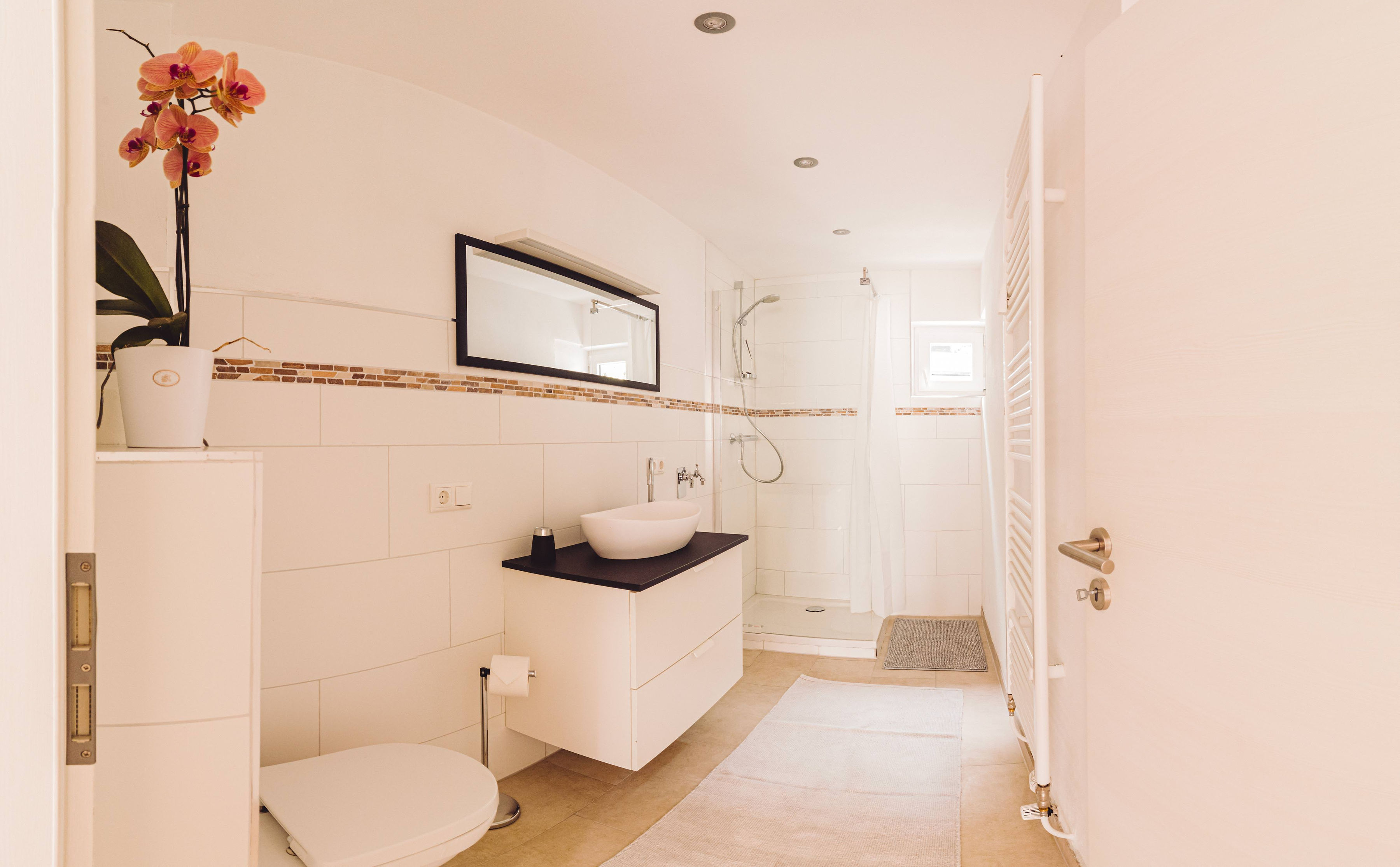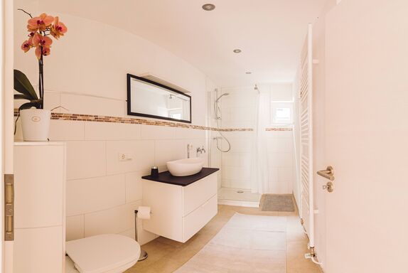 Das Badezimmer besitzt eine flach begehbare Dusche, eine Fußbodenheizung, einen Heizkörperhandtuchhalter, ein WC, ein Waschbecken, ein Fenster und einen Föhn.