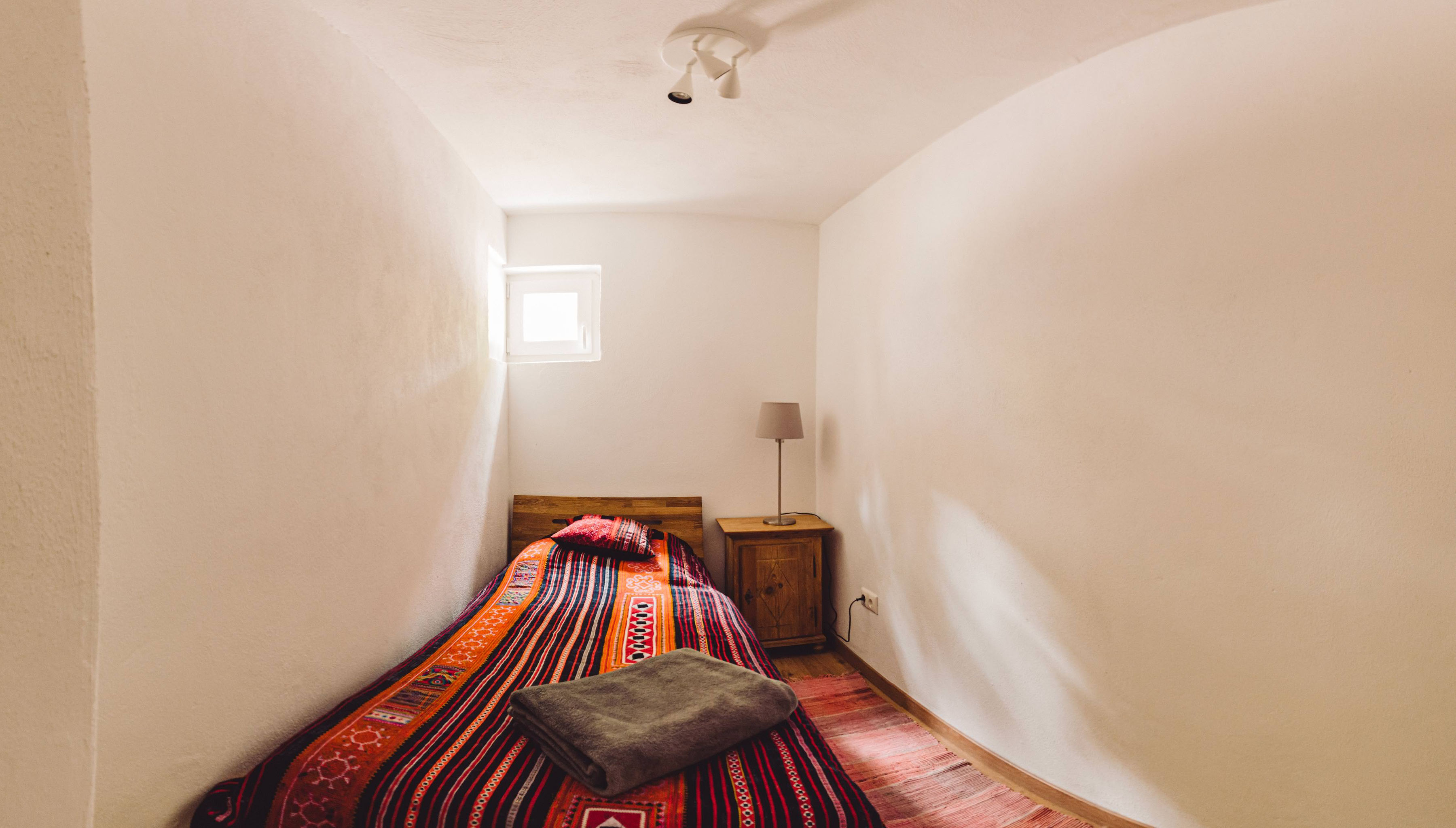 Das Schlafzimmer ist mit einem Einzelbett und Nachttisch ausgestattet.