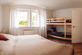 Das Schlafzimmer hat ein Doppelbett mit Nachttischen sowie ein Etagenbett.