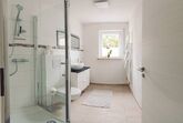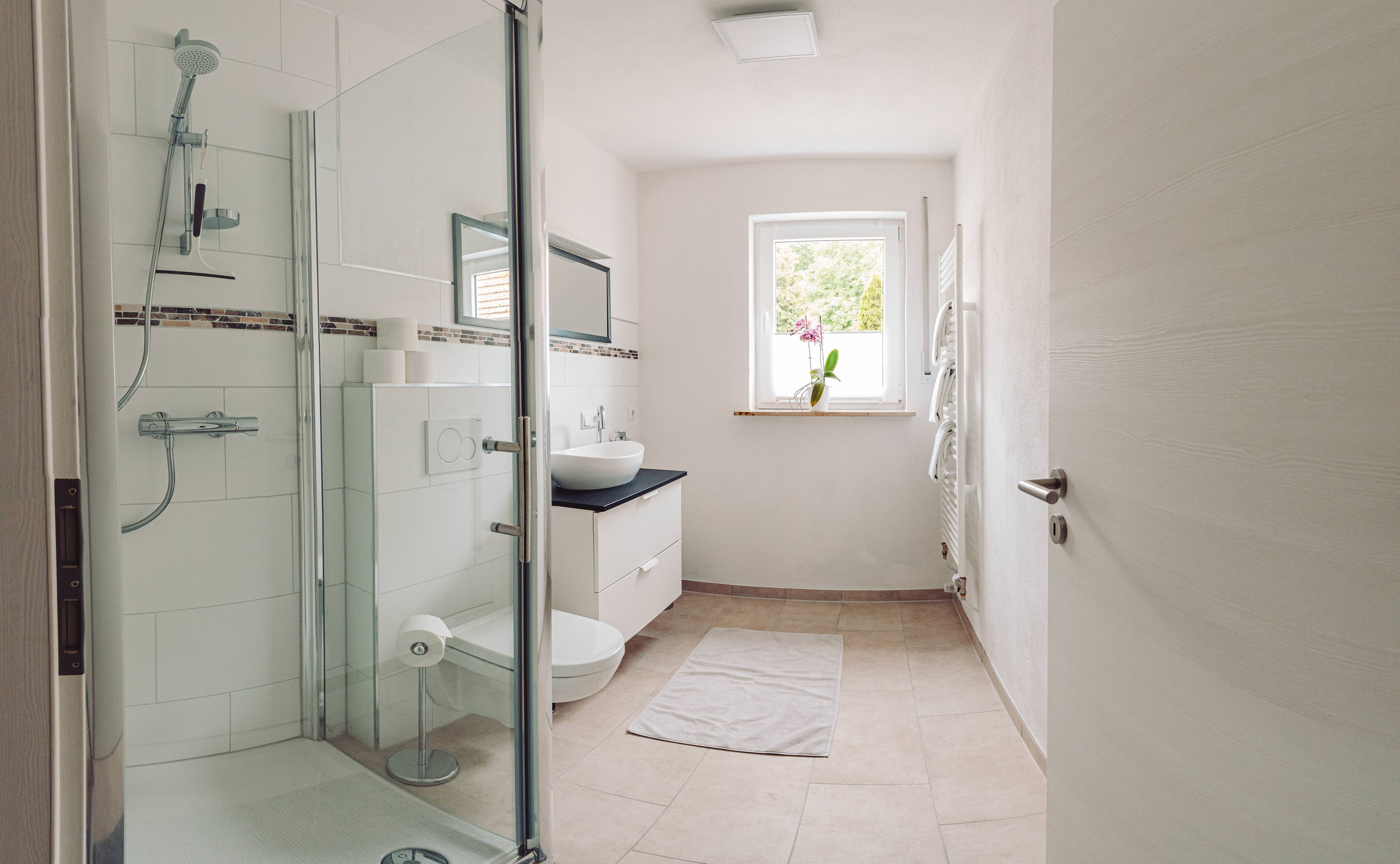 Das Badezimmer besitzt eine flach begehbare Dusche, eine Fußbodenheizung, einen Heizkörperhandtuchhalter, ein WC, ein Waschbecken, ein Fenster und einen Föhn.