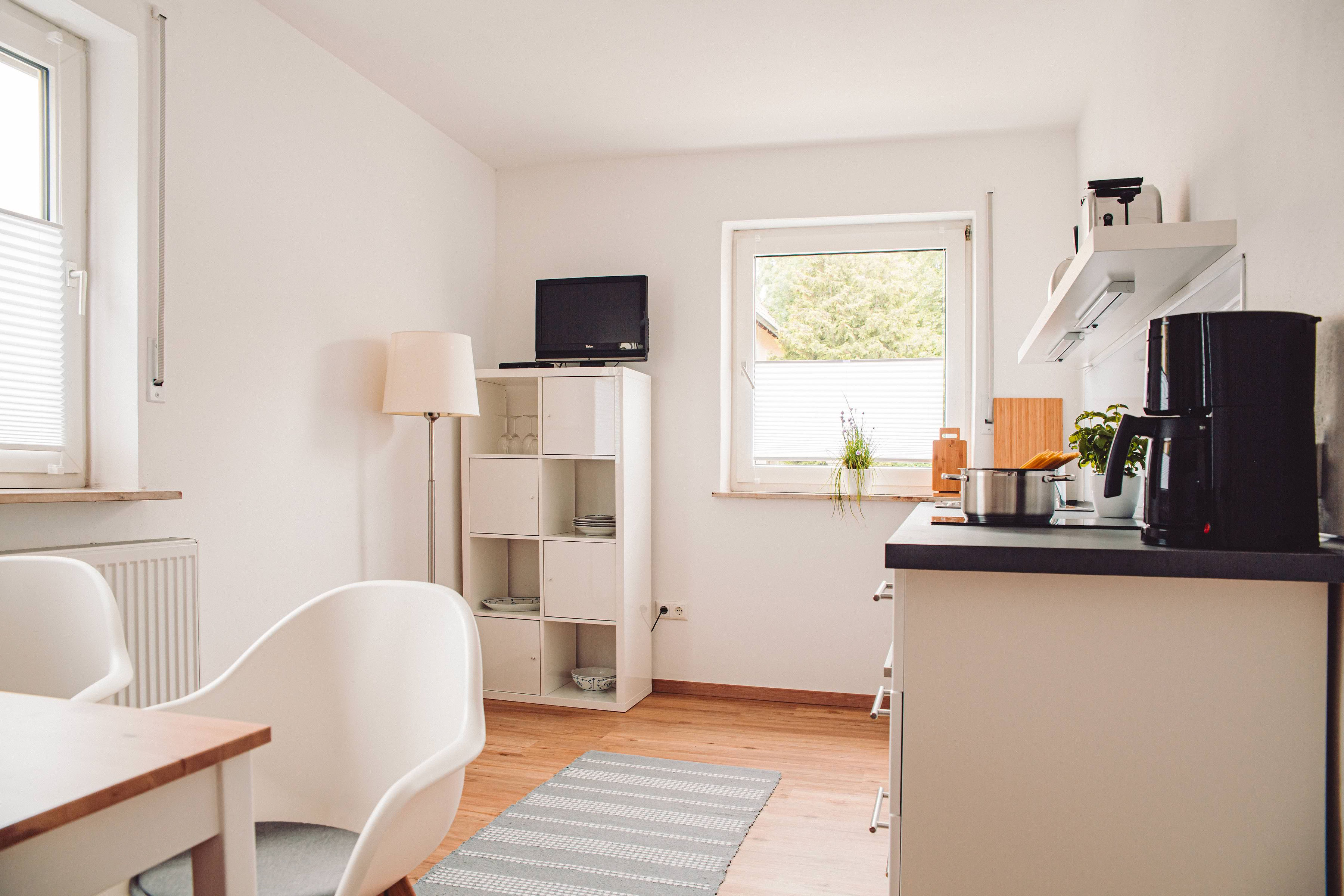 Die Küchenzeile in der Wohnküche beinhaltet einen Kühlschrank inkl. Gefrierfach, einen Induktionsherd mit Backröhre, eine Spülmaschine, eine Kaffeemaschine, einen Toaster sowie Wasser- und Eierkocher. Der Essbereich ist zusätzlich mit einem Fernseher ausgestattet.