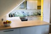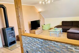 Die Ferienwohnung befindet sich im ersten Stock und bietet mit ihren 75 m² Platz für bis zu 4 Personen. Die modern eingerichtete Ferienwohnung verfügt über einen offenen Wohnbereich mit Küche, Essplatz, Sofa. Die Küche ist ausgestattet mit einem Geschirrspüler, Kühl- Gefrierkombination, Kaffeemaschine, Toaster, Wasserkocher, Induktionskochfeld und Backofen. Für gemütliche Stunden ist im Wohnbereich ein Kamin integriert. Ein Schlafzimmer ist mit einem gemütlichen Doppelbett ausgestattet, im zweiten Schlafzimmer sind zwei getrennte Betten. Das Tageslichtbad verfügt über eine Badewanne, Dusche und WC.
