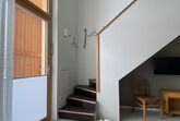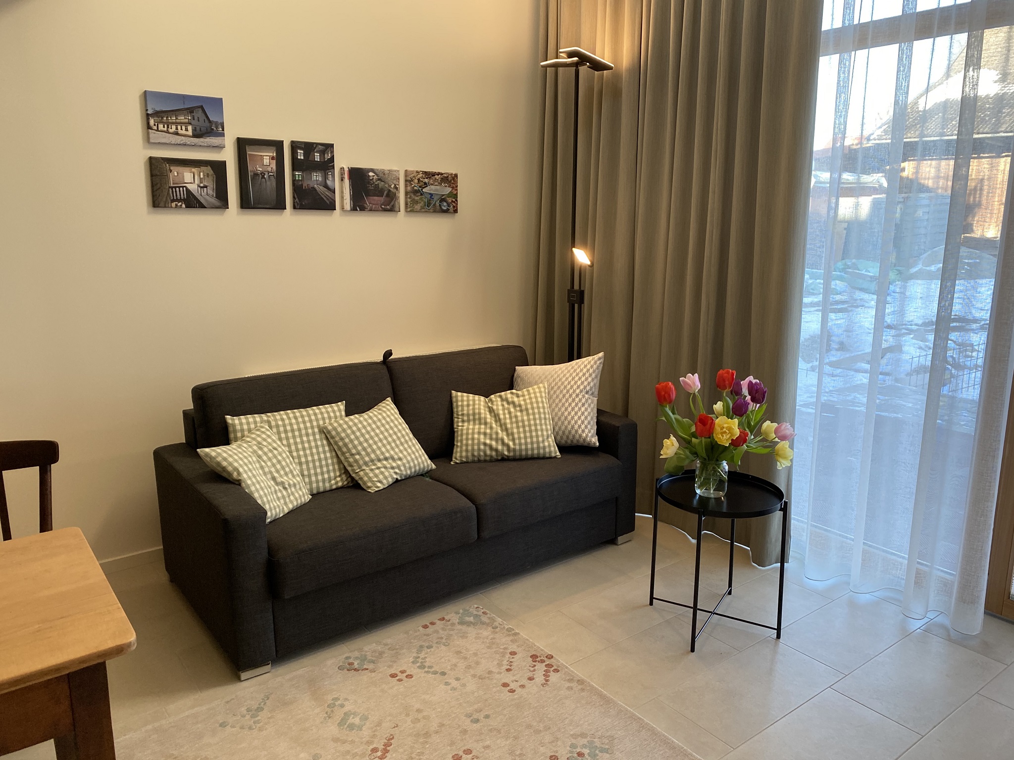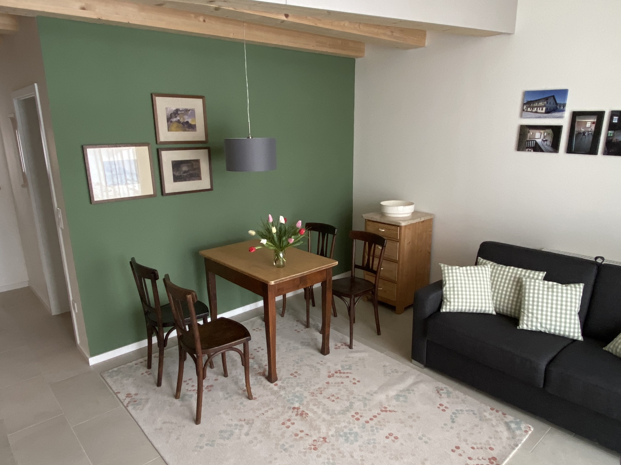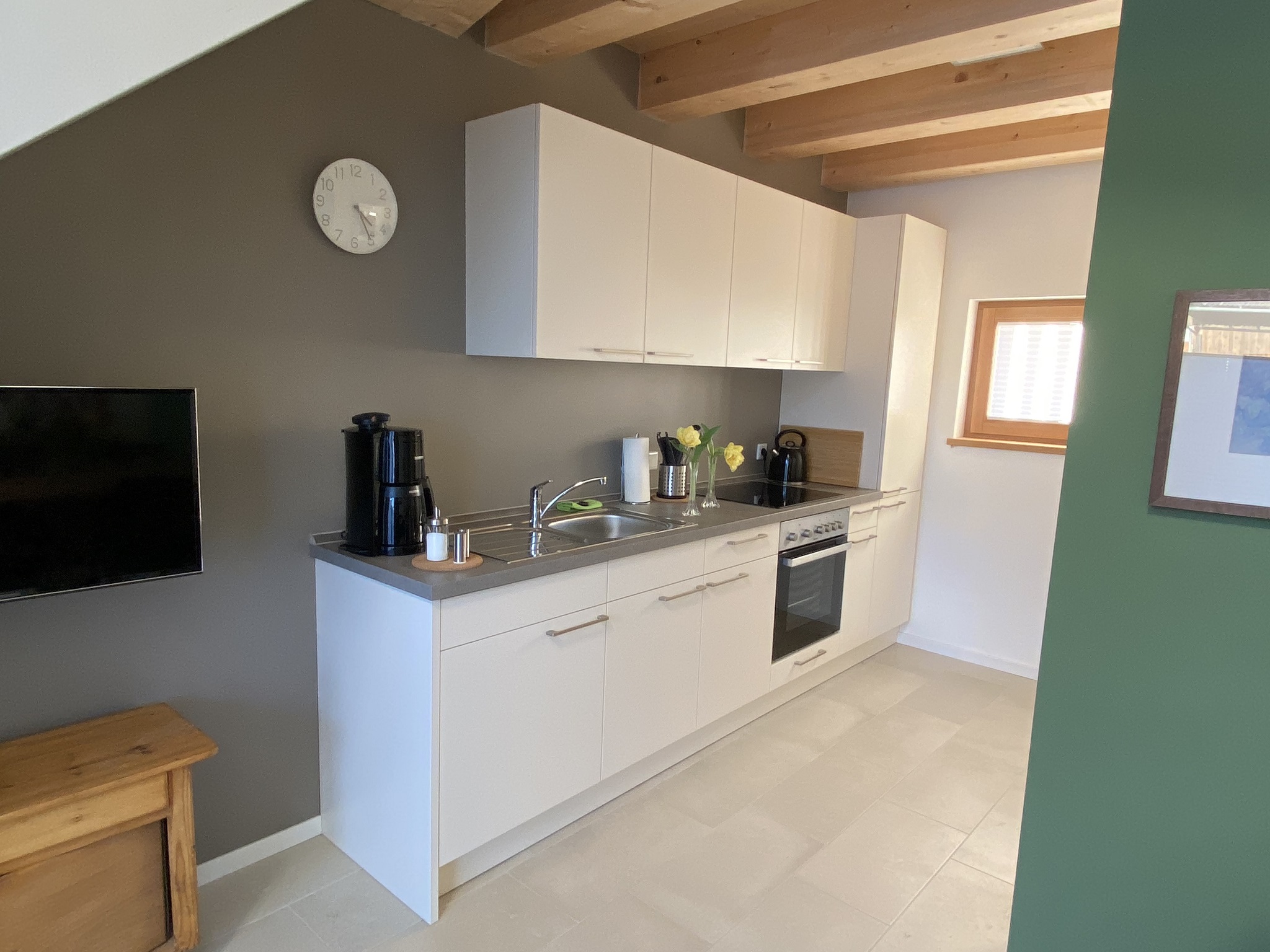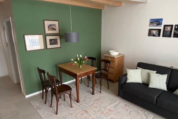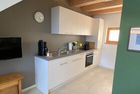Die Ferienwohnung befindet sich in einem Holzneubau. Im Erdgeschoss befinden sich eine offene Küche, ein Esstisch mit 4 Stühlen, Sofa, Smart-TV und das Badezimmer mit WC und ebenerdiger Dusche.