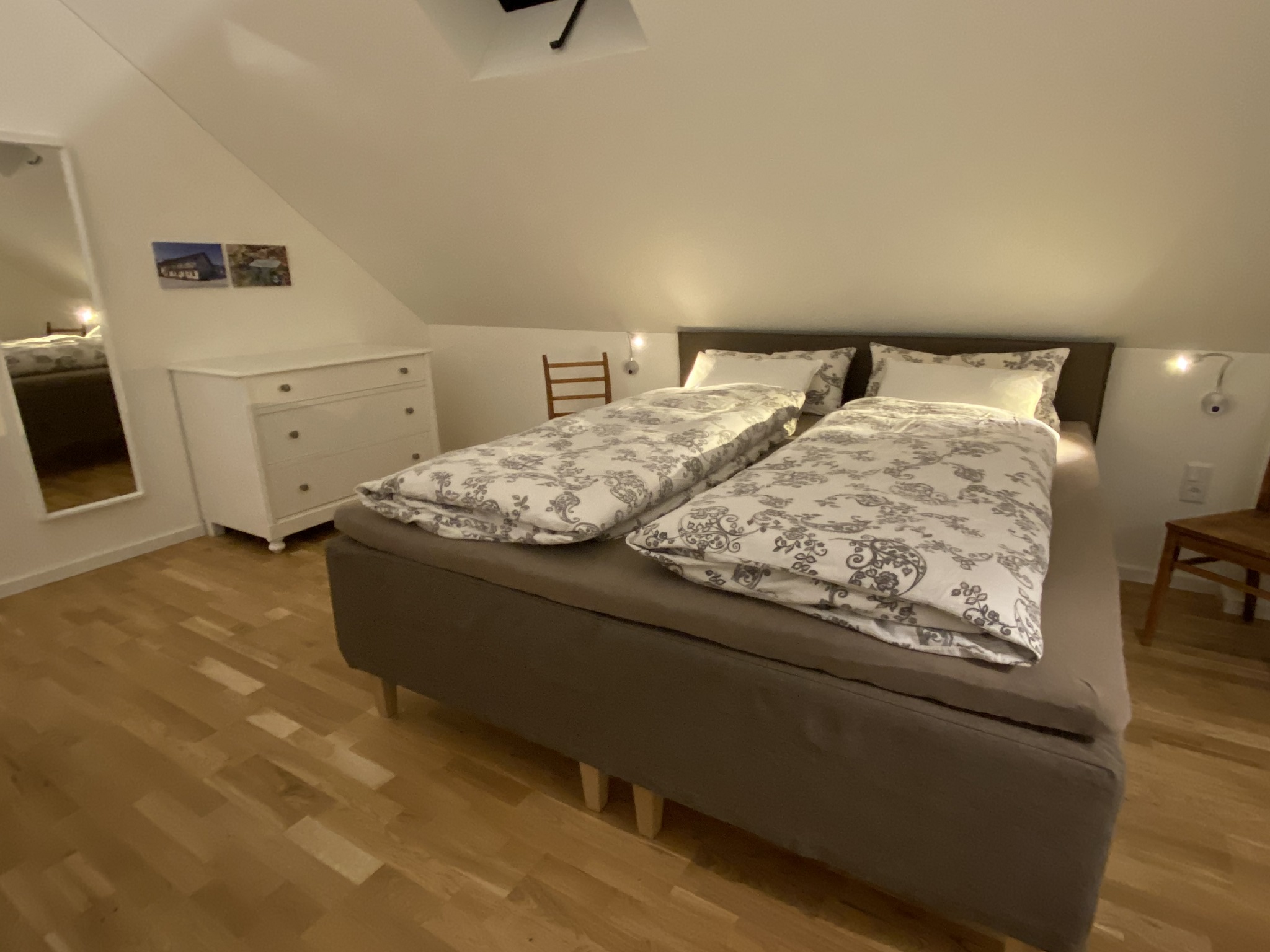 Auf der großen Schlafgalerie erwartet Sie ein King-Size Boxspringbett für 2 Personen (Fennobed).