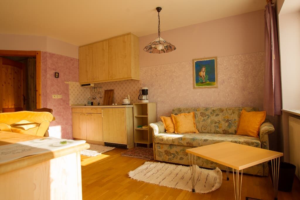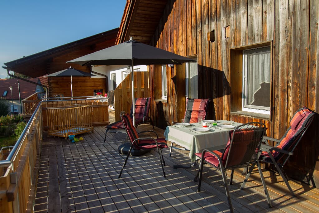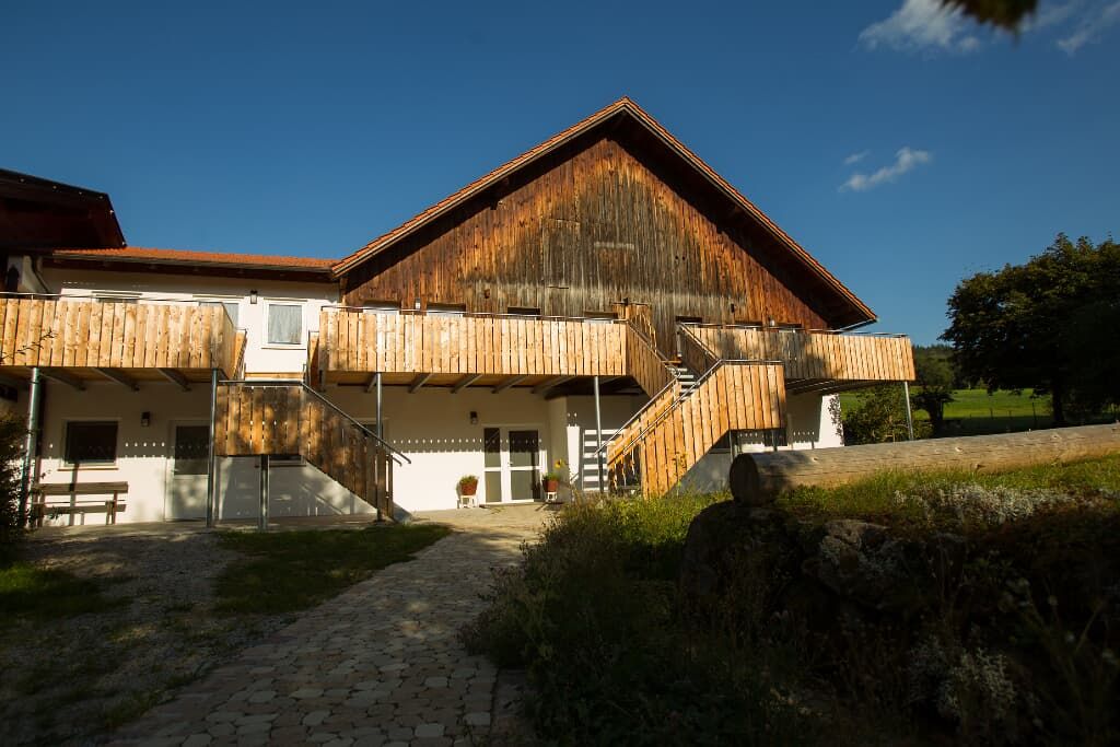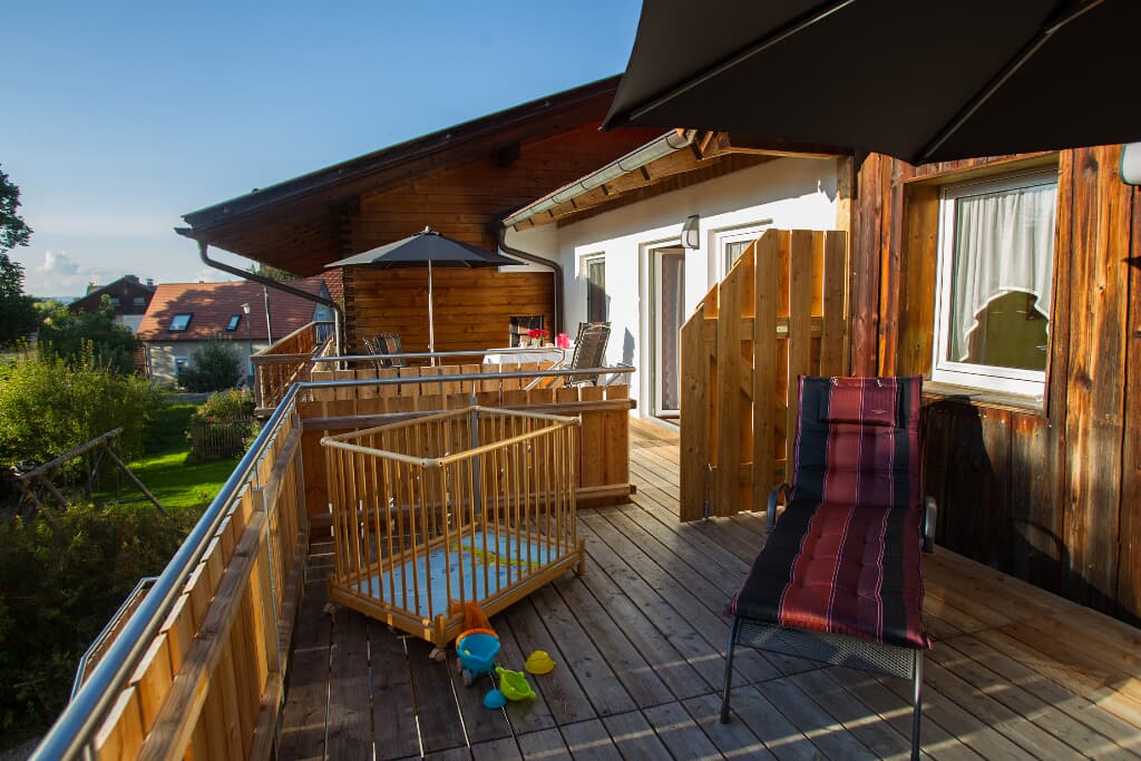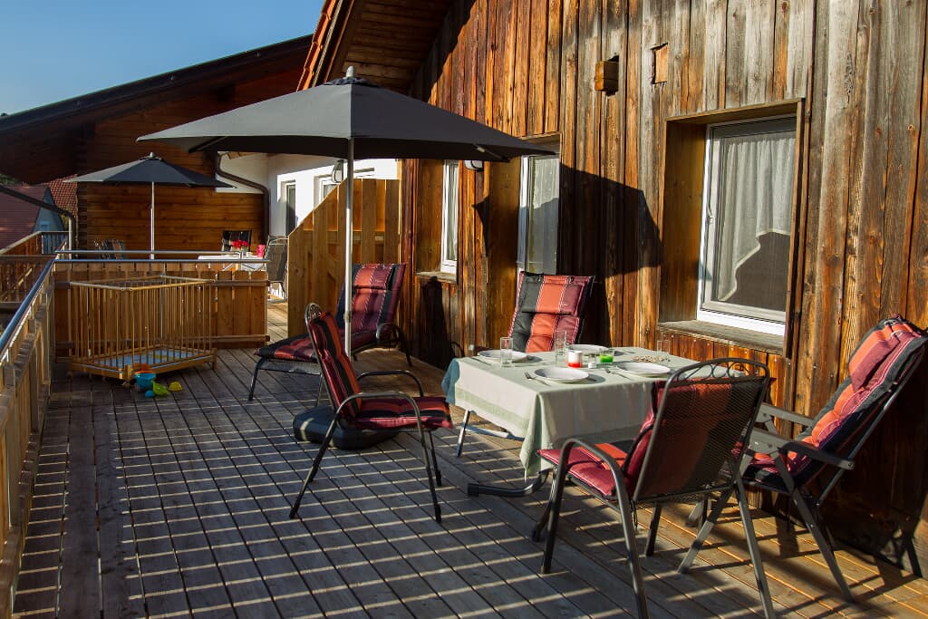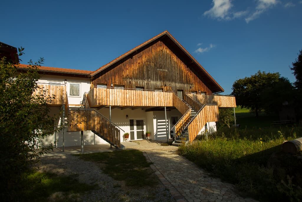 Entspannung und Ruhe inmitten der Natur – kinderfreundliche Ferien genießen Finden Sie Erholung auf unseren großzügigen Balkonen. Die Kinder sammeln Naturerfahrung im angrenzenden Wald und spielen auf unserer nahe gelegenen Spielwiese. Ein kleines Bächlein lädt zum Verweilen ein. Ohne Durchgangsverkehr erleben Sie Entspannung pur. Unsere Ferienwohnungen mit Schlafzimmer und separatem Kinderzimmer, sowie Einbauküche mit Kaffeemaschine und Kühlschrank bieten alles, was für einen entspannten Urlaub nötig ist. Wir bieten einen Brötchenservice, damit der Tag gut beginnen kann. Parkplätze befinden sich am Gebäude. Die unmittelbare Umgebung lädt zu Spaziergängen ein. Wanderwege und Radwege, sowie der Perlsee bieten die Möglichkeit, sich sportlich zu betätigen. Wir freuen uns, Sie bei uns begrüßen zu dürfen! Sommer: Die Kinder dürfen auf dem sonnengeschützten Spielplatz schaukeln, Ball spielen und am seichten Bach Edelsteine suchen. Fußballtore laden zu bolzen ein. Bobbycars vorhanden, sowie Tischtennis im Innenbereich. Winter: Neben dem Haus befindet sich ein flacher Hügel, wo die Kinder in Sichtnähe der Eltern ohne Gefahr mit Bobs und Tellern rutschen können.