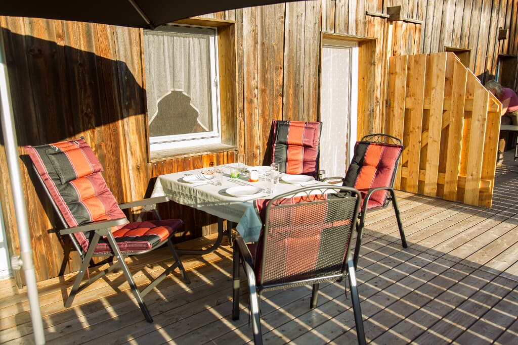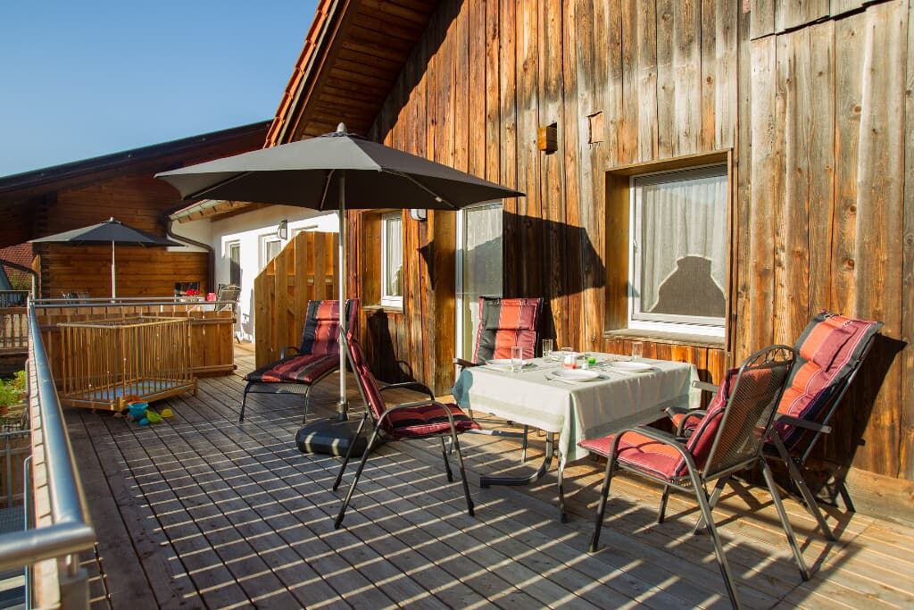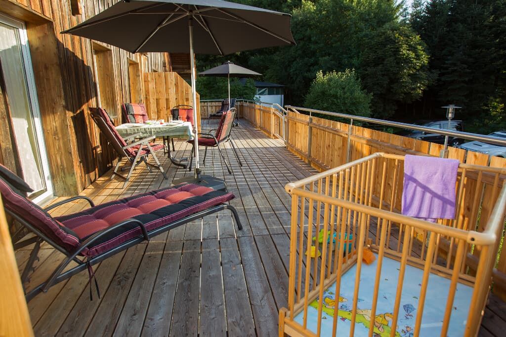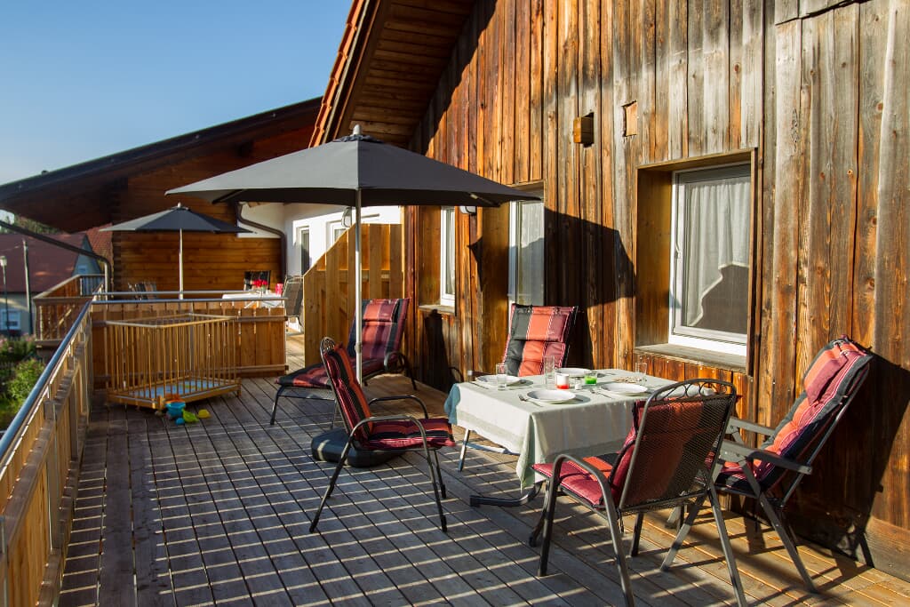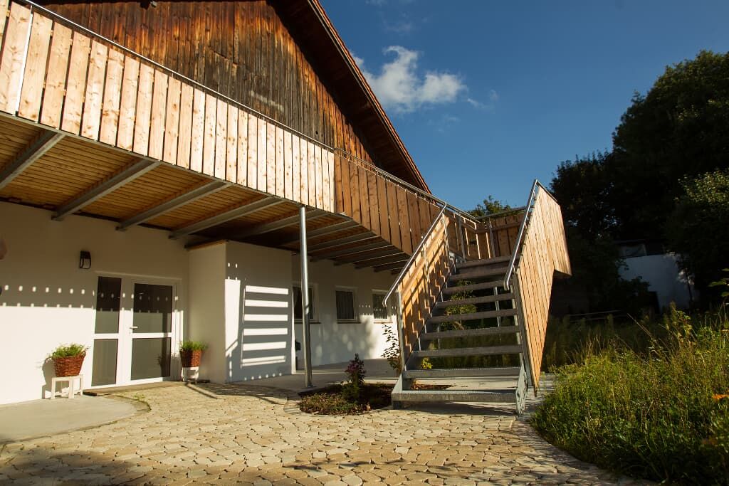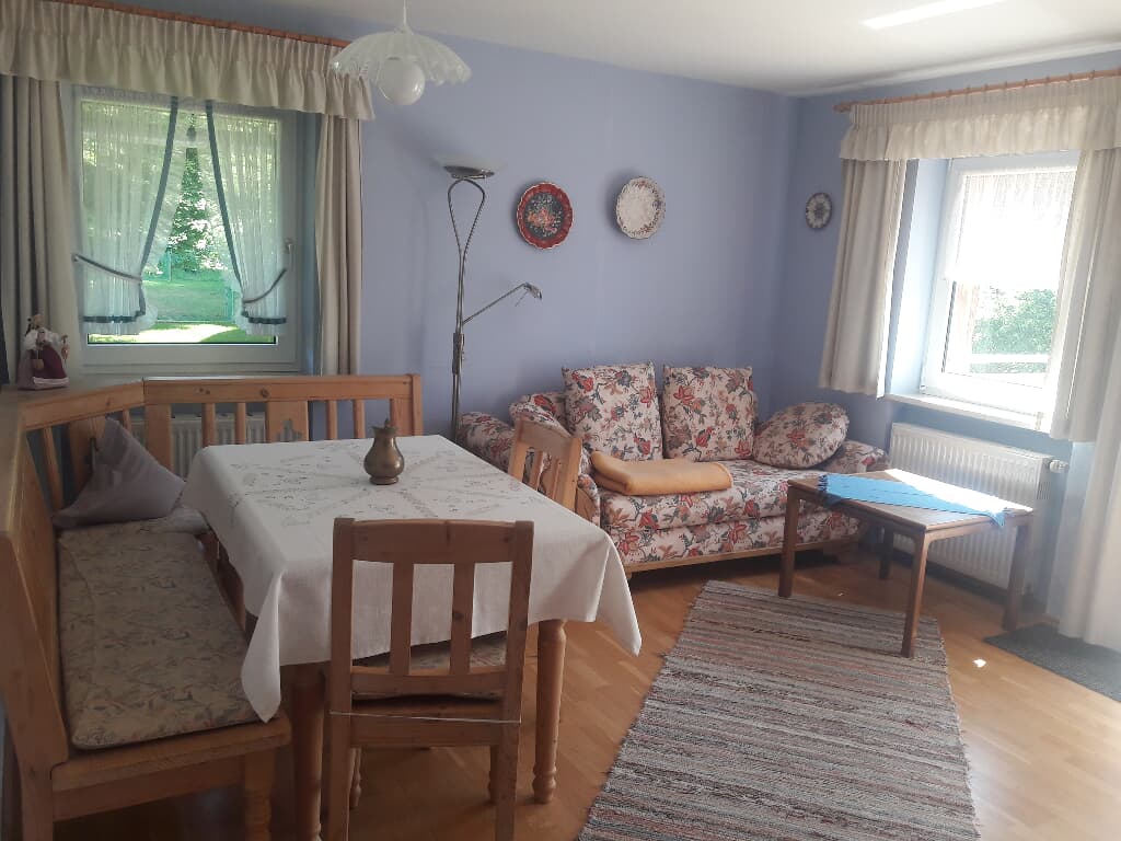 Entspannung und Ruhe inmitten der Natur – kinderfreundliche Ferien genießen Finden Sie Erholung auf unseren großzügigen Balkonen. Die Kinder sammeln Naturerfahrung im angrenzenden Wald und spielen auf unserer nahe gelegenen Spielwiese. Ein kleines Bächlein lädt zum Verweilen ein. Ohne Durchgangsverkehr erleben Sie Entspannung pur. Unsere Ferienwohnungen mit Schlafzimmer und separatem Kinderzimmer, sowie Einbauküche mit Kaffeemaschine und Kühlschrank bieten alles, was für einen entspannten Urlaub nötig ist. Wir bieten einen Brötchenservice, damit der Tag gut beginnen kann. Parkplätze befinden sich am Gebäude. Die unmittelbare Umgebung lädt zu Spaziergängen ein. Wanderwege und Radwege, sowie der Perlsee bieten die Möglichkeit, sich sportlich zu betätigen. Wir freuen uns, Sie bei uns begrüßen zu dürfen! Sommer: Die Kinder dürfen auf dem sonnengeschützten Spielplatz schaukeln, Ball spielen und am seichten Bach Edelsteine suchen. Fußballtore laden zu bolzen ein. Bobbycars vorhanden, sowie Tischtennis im Innenbereich. Winter: Neben dem Haus befindet sich ein flacher Hügel, wo die Kinder in Sichtnähe der Eltern ohne Gefahr mit Bobs und Tellern rutschen können.