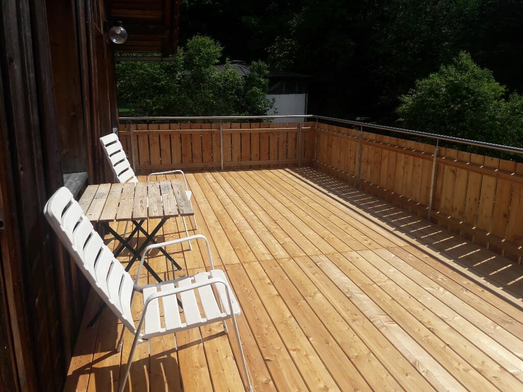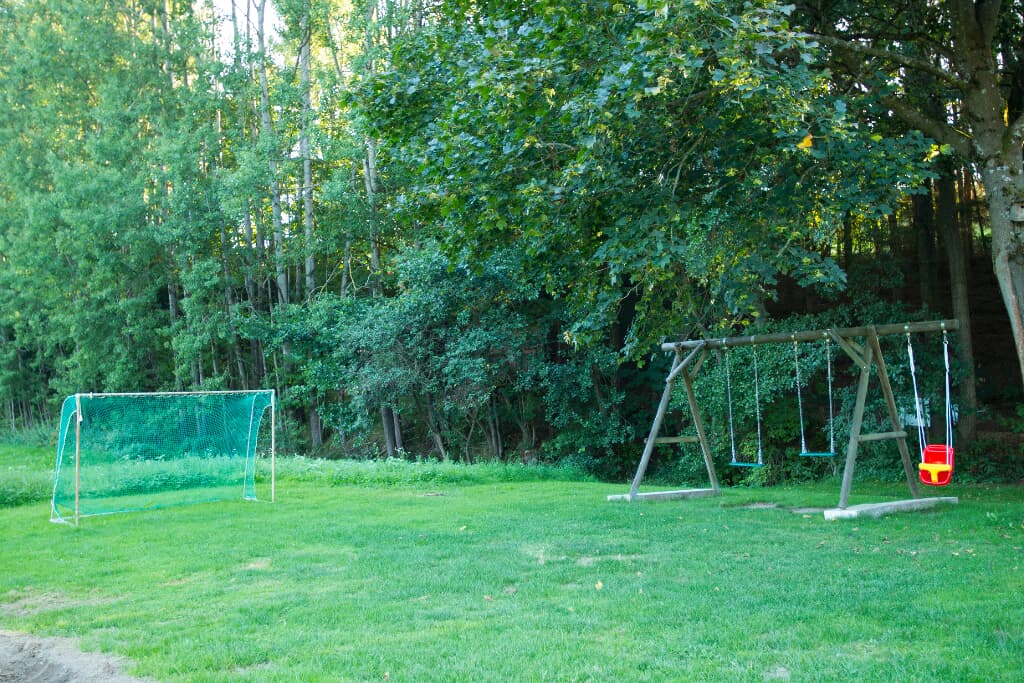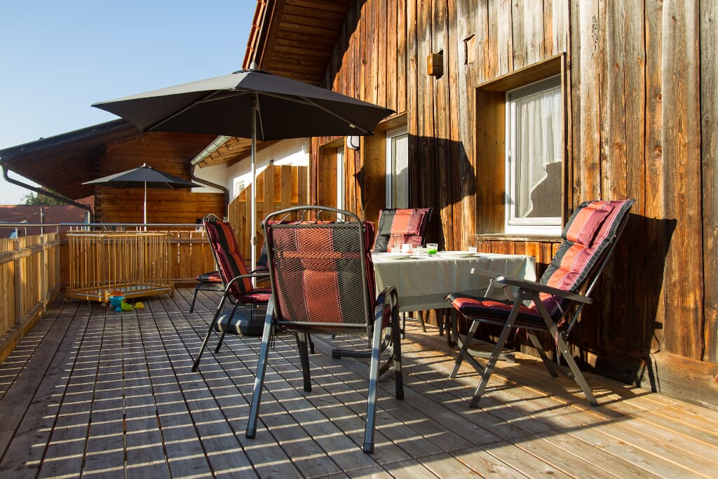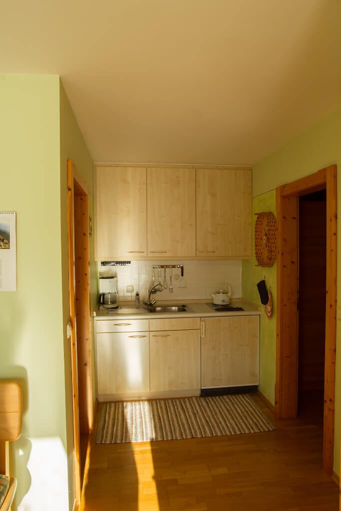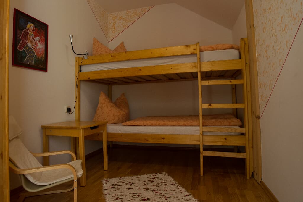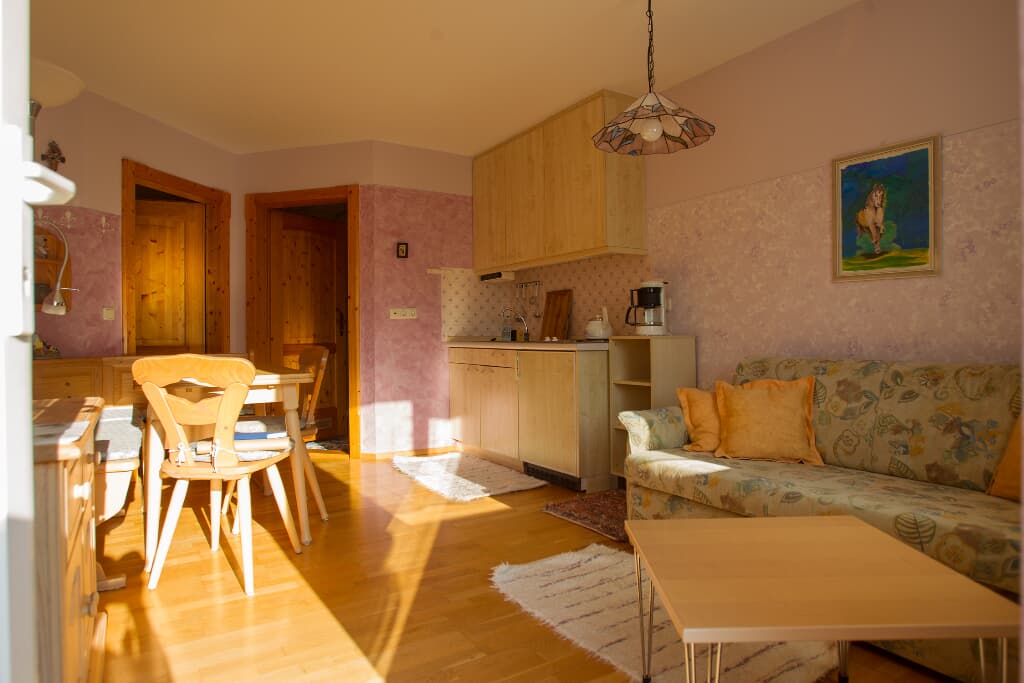 Entspannung und Ruhe inmitten der Natur – kinderfreundliche Ferien genießen Finden Sie Erholung auf unseren großzügigen Balkonen. Die Kinder sammeln Naturerfahrung im angrenzenden Wald und spielen auf unserer nahe gelegenen Spielwiese. Ein kleines Bächlein lädt zum Verweilen ein. Ohne Durchgangsverkehr erleben Sie Entspannung pur. Unsere Ferienwohnungen mit Schlafzimmer und separatem Kinderzimmer, sowie Einbauküche mit Kaffeemaschine und Kühlschrank bieten alles, was für einen entspannten Urlaub nötig ist. Wir bieten einen Brötchenservice, damit der Tag gut beginnen kann. Parkplätze befinden sich am Gebäude. Die unmittelbare Umgebung lädt zu Spaziergängen ein. Wanderwege und Radwege, sowie der Perlsee bieten die Möglichkeit, sich sportlich zu betätigen. Wir freuen uns, Sie bei uns begrüßen zu dürfen! Sommer: Die Kinder dürfen auf dem sonnengeschützten Spielplatz schaukeln, Ball spielen und am seichten Bach Edelsteine suchen. Fußballtore laden zu bolzen ein. Bobbycars vorhanden, sowie Tischtennis im Innenbereich. Winter: Neben dem Haus befindet sich ein flacher Hügel, wo die Kinder in Sichtnähe der Eltern ohne Gefahr mit Bobs und Tellern rutschen können.