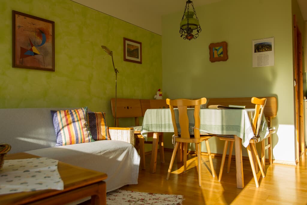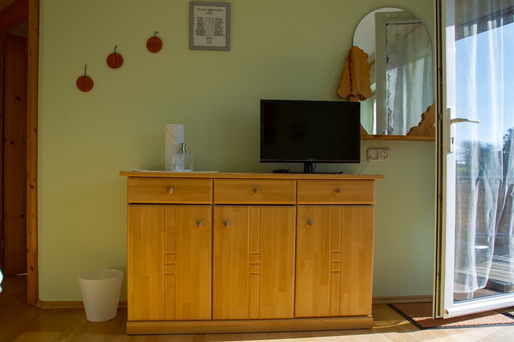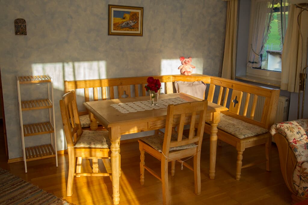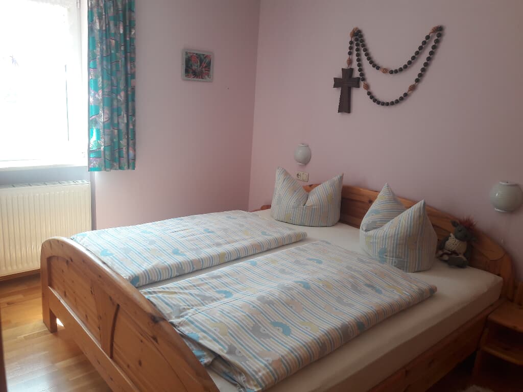 Entspannung und Ruhe inmitten der Natur In unseren Ferienwohnungen finden Sie Erholung in einem Schlafzimmer mit Doppelbett. Die Kinder schlafen im separaten Kinderzimmer mit Etagenbett. Auf Wunsch wird ein Babybett zugestellt. Der Wohn- und Essraum bietet Platz für gemütliches Beisammensein. In der voll ausgestatteten Einbauküche sind Kaffeemaschine, Wasserkessel und Kühlschrank vorhanden. Im Bad mit Dusche und WC werden die Handtücher und Duschtücher gestellt und 2x wöchentlich gewechselt. Alle Böden sind wischbar und allergikerfreundlich. Lassen Sie sich nach Ihren Ausflügen in die Couchkissen fallen und schauen die selbst gemachten Urlaubsbilder und -filme auf dem Smart-TV an oder wählen Sie Ihr individuelles Programm aus. Unser Haus verfügt selbstverständlich über einen WLAN-Anschluss. Den Urlaubstag können Sie auf dem großzügigen Balkon in der Abendsonne ausklingen lassen. Genießen Sie die Ruhe in Waldnähe und ohne Durchgangsverkehr.