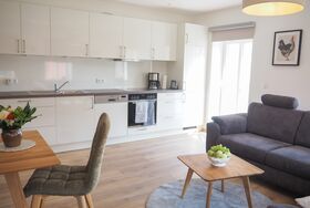 Die vollausgestattete Küche verfügt über: Cerankochfeld, Backofen, Geschirrspüler, Kühl- und Gefrierschrank, Wasserkocher, Toaster und einer Filterkaffeemaschine. Das Schlafzimmer findet sich ein großes, bequemes Doppelbett. Das neue Bad verfügt über eine begehbare Dusche mit Waschbecken und WC. Handtücher sowie Handtuch- und Haartrockner sind vorhanden. Das W-Lan sowie den Parkplatz nutzen Sie kostenlos.