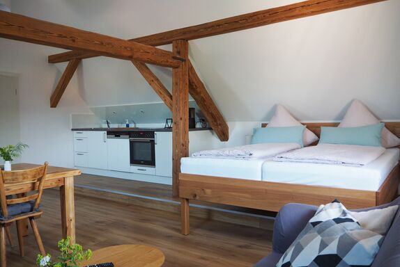 Wasserkocher,Toaster und einer Filterkaffeemaschine ausgestattet. Der Schlafbereich hat ein Doppelbett mit einer Größe von 180x200cm, ein seperates Einzelbett mit 100x200cm steht zusätzlich bereit. Ein Sofa mit Couchtisch und ein Esstisch mit Stühlen lädt zum gemütlichen Wohnen ein. Das neue Bad verfügt über eine Dusche mit Waschbecken und WC. Handtücher sowie Handtuch- und Haartrockner sind vorhanden. Das W-Lan sowie den Parkplatz nutzen Sie kostenlos.