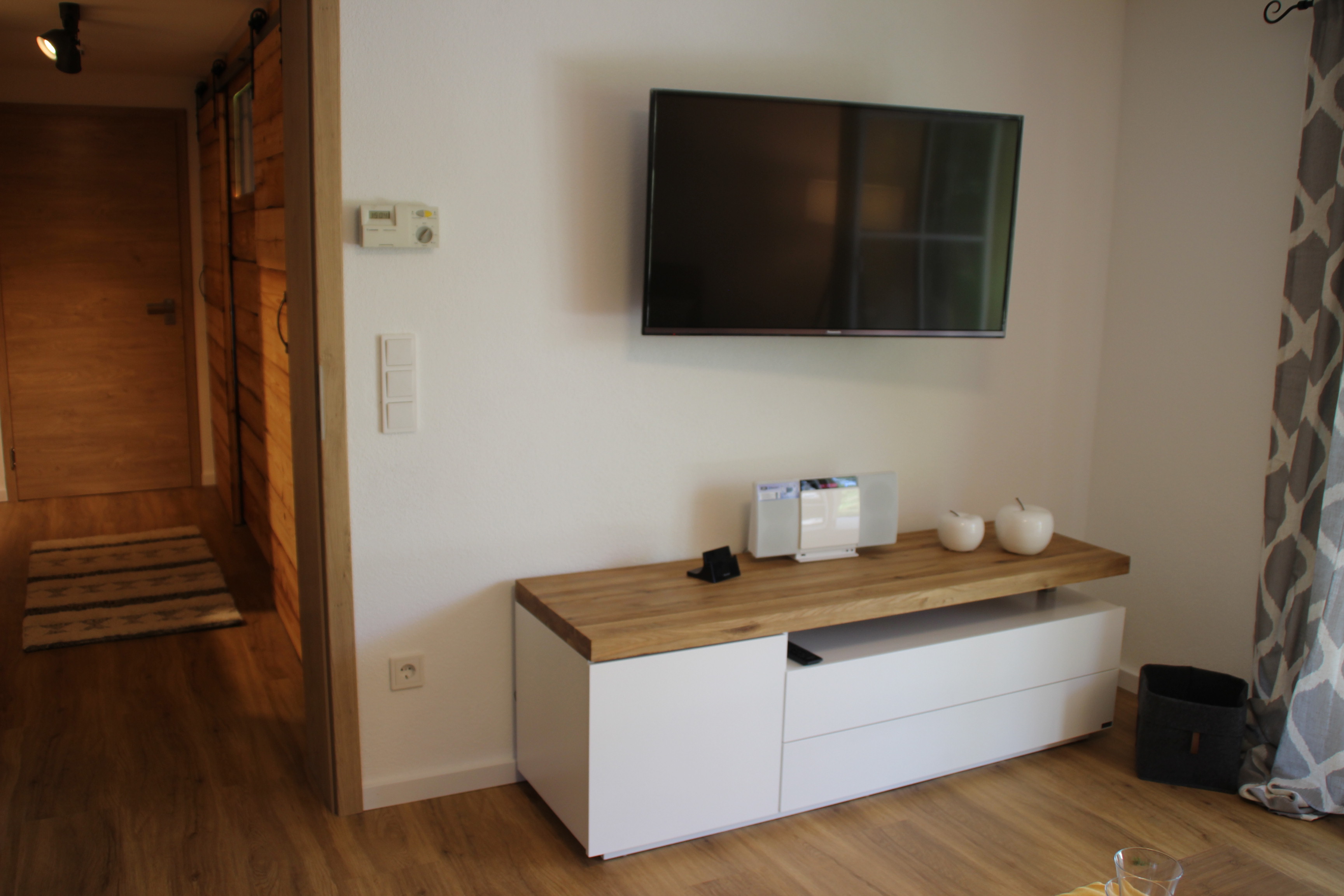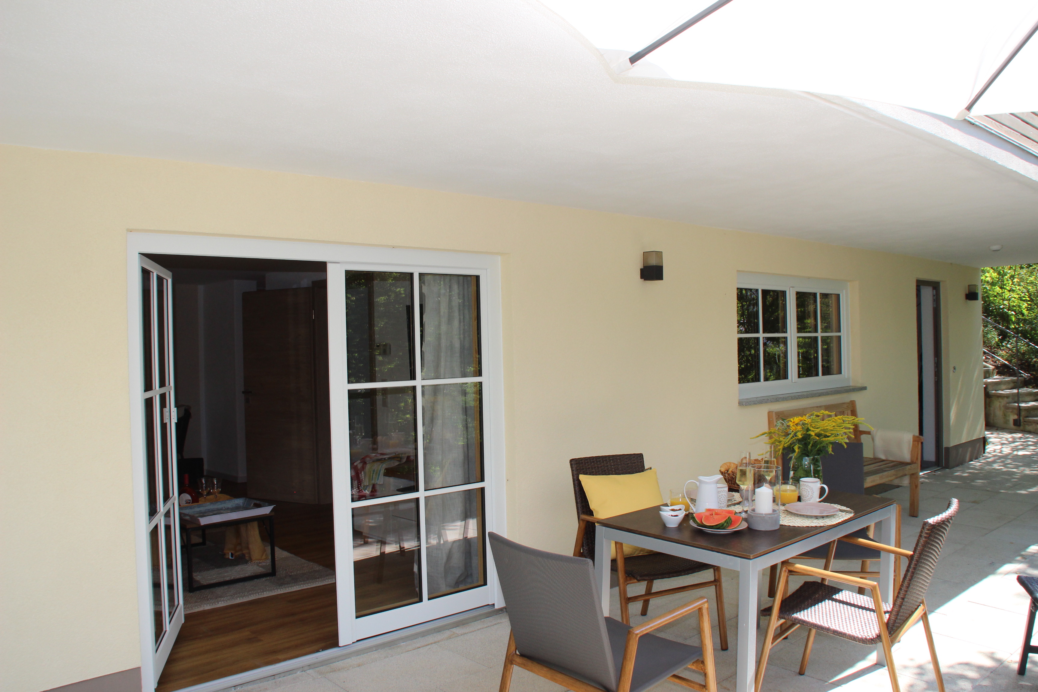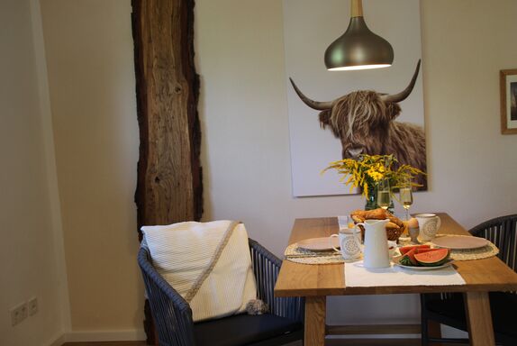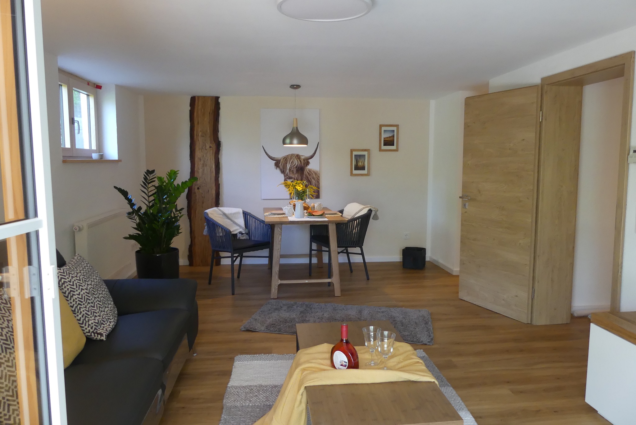 Unsere traumhafte Ferienwohnung „Drei Eichen“ bietet Ihnen auf 55 qm komfortable Räume für eine erholsame Kuschelzeit zu Zweit. Die Wohnung befindet sich im Erdgeschoss und hat einen großzügigen Ess-/Wohnbereich im Naturambiente mit Ledercouch und elektrischer Liegefunktion, einen Echtholz-Esstisch mit gemütlichen Sesseln, SAT-TV, Stereoanlage, CD-Player, Telefon, LAN-Verbindung (auf Wunsch WLAN). Von dort haben Sie einen direkten Zugang zur großen Sonnenterrasse.Eine vollausgestattete Landhausküche mit Spülmaschine, Kühl- und Gefrierschrank, Backofen, Kaffeemaschine, Kaffee- und Teebar, Toaster, Eierkocher und Mixstab lassen keine Wünsche offen. Ein modernes Schlafzimmer mit Boxspringbett, Kuscheldecken, Wärmeflasche und Bio-Dinkelkissen sorgen für einen guten Schlaf. Das Badezimmer mit WC, Dusche, Handtuchtrockner, Föhn, Ganzkörperspiegel und flauschigen Hand- und Badetüchern stehen für Sie bereit.Eine große Außenterrasse mit Sonnenliegen, Bestuhlung, Sonnenschirme und ein wunderschöner Wohlfühl-Naturgarten auf 1100 m², eine offene Feuerstelle, Gartendusche, ein abschließbarer Fahrradraum und ein offenes Carport direkt vor der Tür ergänzen unser Angebot für Ihren Aufenthalt.