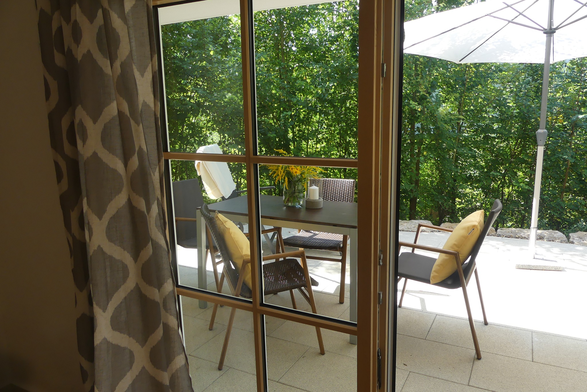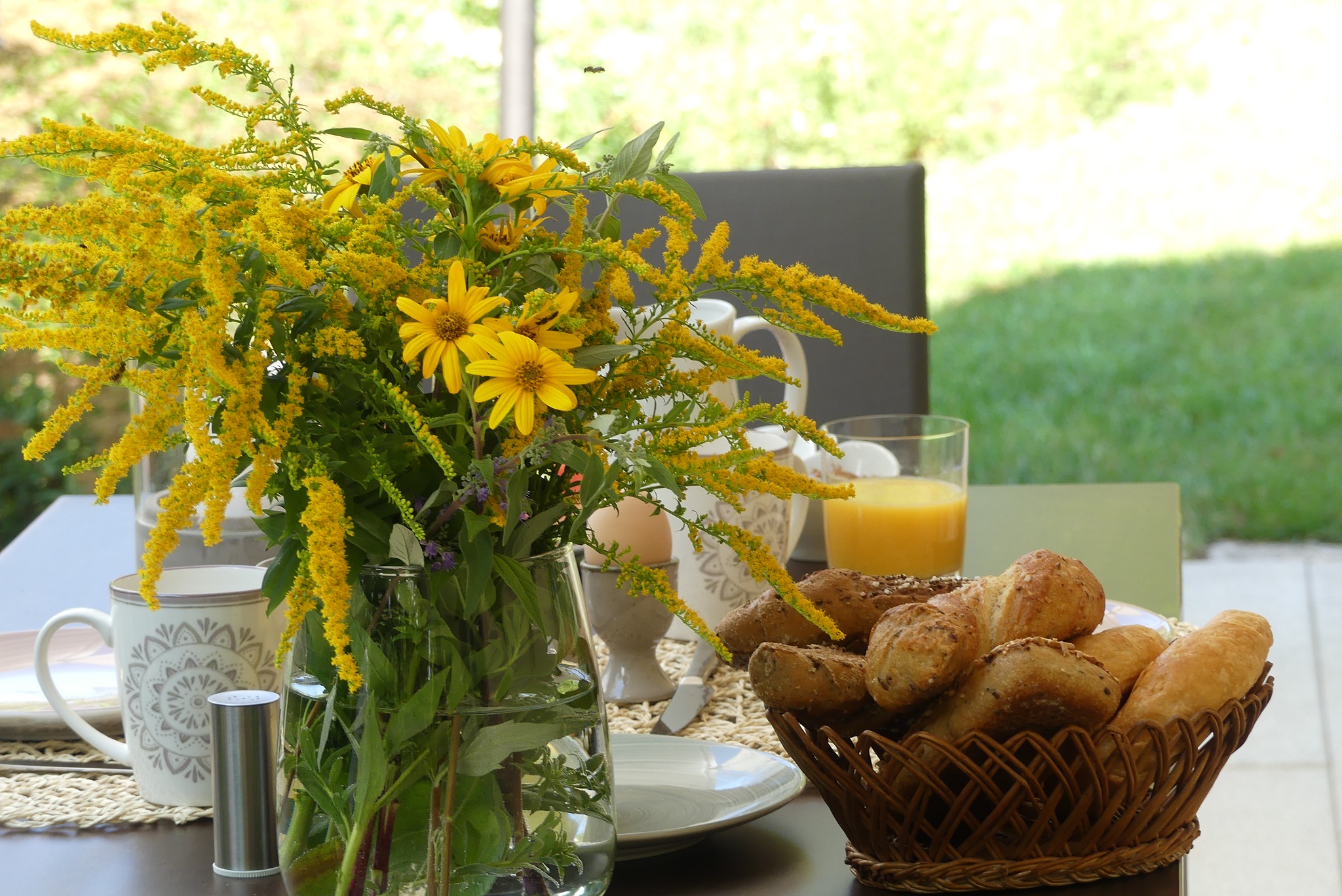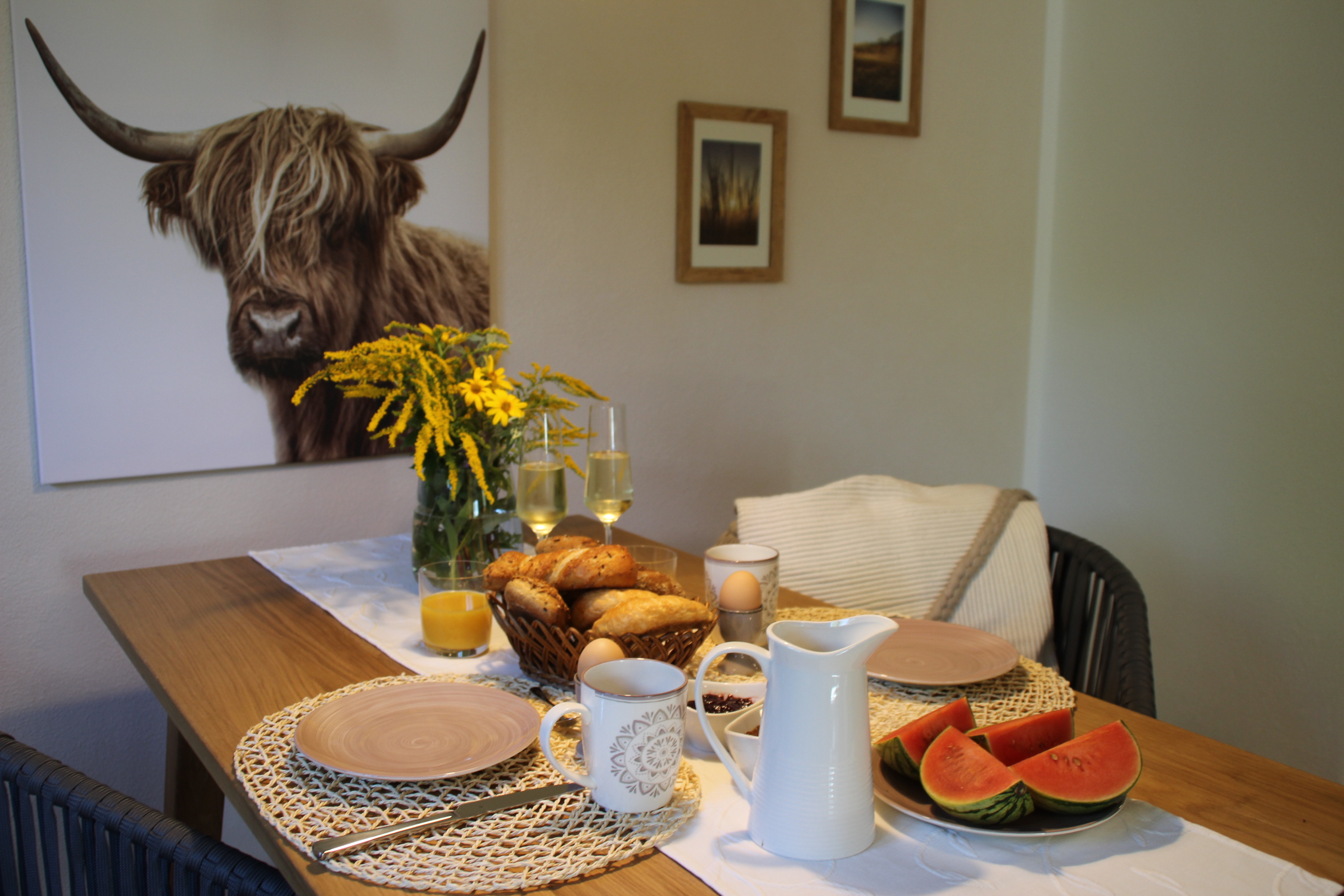 Unsere traumhafte Ferienwohnung „Drei Eichen“ bietet Ihnen auf 55 qm komfortable Räume für eine erholsame Kuschelzeit zu Zweit. Die Wohnung befindet sich im Erdgeschoss und hat einen großzügigen Ess-/Wohnbereich im Naturambiente mit Ledercouch und elektrischer Liegefunktion, einen Echtholz-Esstisch mit gemütlichen Sesseln, SAT-TV, Stereoanlage, CD-Player, Telefon, LAN-Verbindung (auf Wunsch WLAN). Von dort haben Sie einen direkten Zugang zur großen Sonnenterrasse.Eine vollausgestattete Landhausküche mit Spülmaschine, Kühl- und Gefrierschrank, Backofen, Kaffeemaschine, Kaffee- und Teebar, Toaster, Eierkocher und Mixstab lassen keine Wünsche offen. Ein modernes Schlafzimmer mit Boxspringbett, Kuscheldecken, Wärmeflasche und Bio-Dinkelkissen sorgen für einen guten Schlaf. Das Badezimmer mit WC, Dusche, Handtuchtrockner, Föhn, Ganzkörperspiegel und flauschigen Hand- und Badetüchern stehen für Sie bereit.Eine große Außenterrasse mit Sonnenliegen, Bestuhlung, Sonnenschirme und ein wunderschöner Wohlfühl-Naturgarten auf 1100 m², eine offene Feuerstelle, Gartendusche, ein abschließbarer Fahrradraum und ein offenes Carport direkt vor der Tür ergänzen unser Angebot für Ihren Aufenthalt.