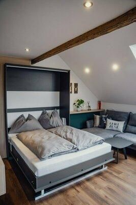 Die 58m2 teilen sich auf in einen Eingangsbereich, einem Schlafzimmer, einem Badezimmer und einem geräumigen Wohnraum. Im Wohnraum befinden sich Küche, Essbereich, Couch + Fernseher sowie ein hochwertiges Klappbett und Zugang zum weitläufigem Garten.