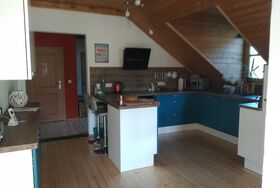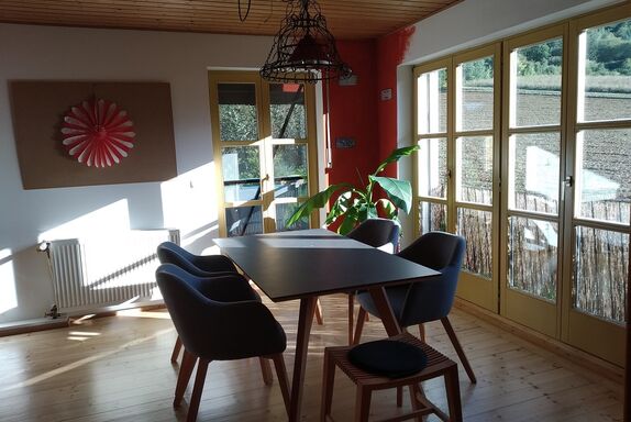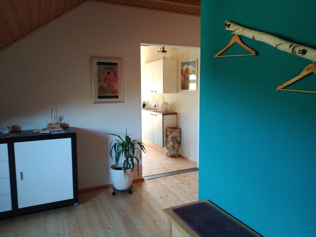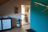 1 großer Eingangsbereich. 1 Schlafzimmer mit Boxspringbett 200x180 für 2 Personen, Bettwäsche, Kleiderschrank, 1 Kinderbett 140x70. Wohnbereich mit 1 Schlafsofa 200x160 für 2 Personen und einem Fernseher. Ein Essbereich mit Kinderstuhl und geräumiger vollausgetatteter Küche (Wasserkocher, Toaster, Kaffeemaschine, Mikrowelle, Kühlschrank, Gefrierschrank, Spülmaschine, Geschirrtücher, Ofen). Essensreste werden auf unserem Grundstück kompostiert oder wir geben sie direkt an unsere hauseigenen Laufenten. Das große Bad verfügt über eine Waschmaschine (Waschmittel vorhanden), Doppelwaschbecken, Badewanne, Bidet, WC, Dusche, Handtücher, Wickelauflage und Spiegelschrank. Die Wohnung ist allergikerfreundlich. Strom gewinnen wir unter anderem aus unserer eigenen Photovoltaik-Anlage. Auch unsere Heizung ist neu und wird durch Solarenergie und Holz beheizt.