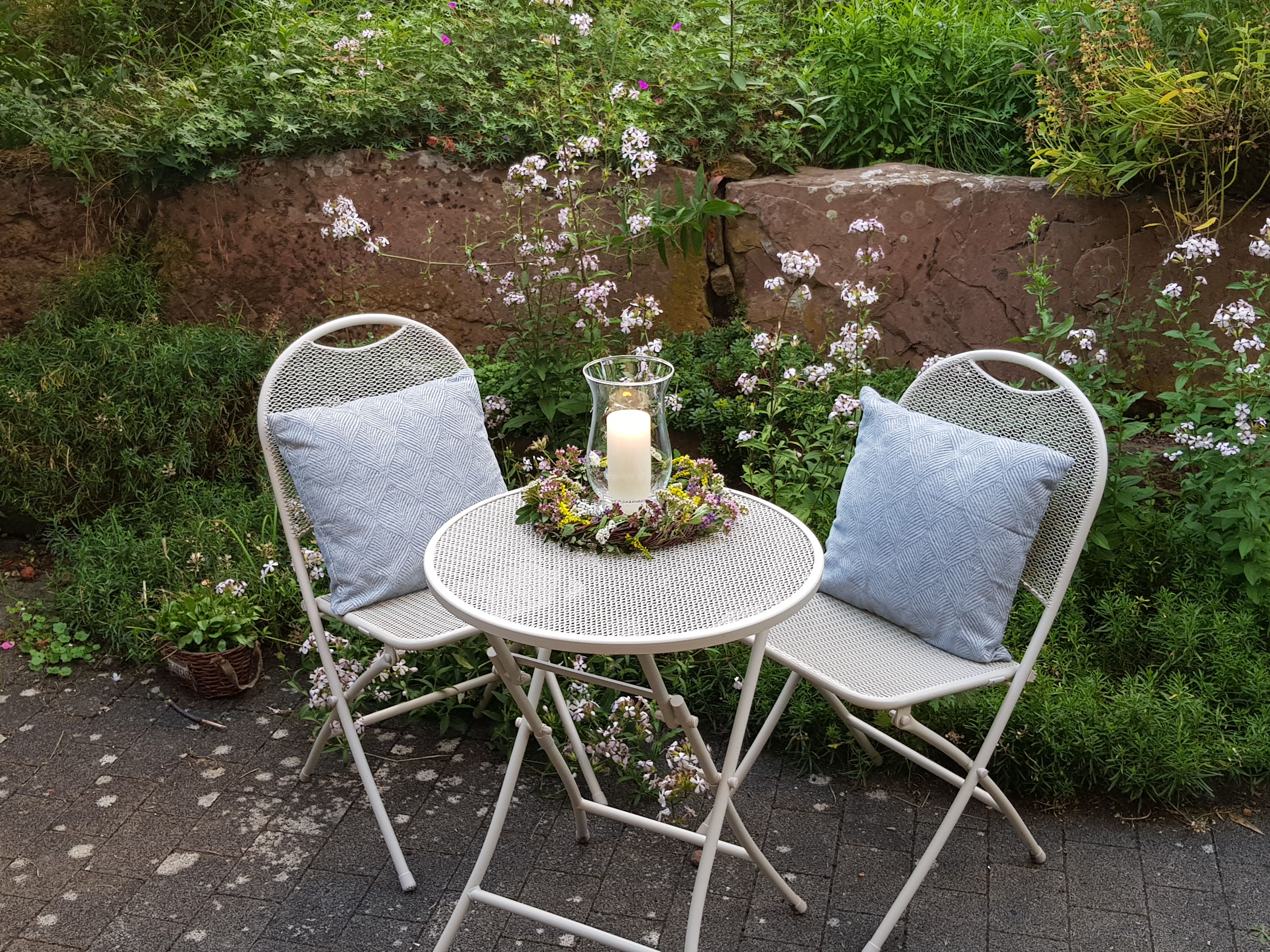 Bei schönem Wetter können Sie Ihren eigenen Sitzplatz im Freien geniessen und z.B. den Abend bei einem gemütlichen Glas Wein ausklingen lassen.