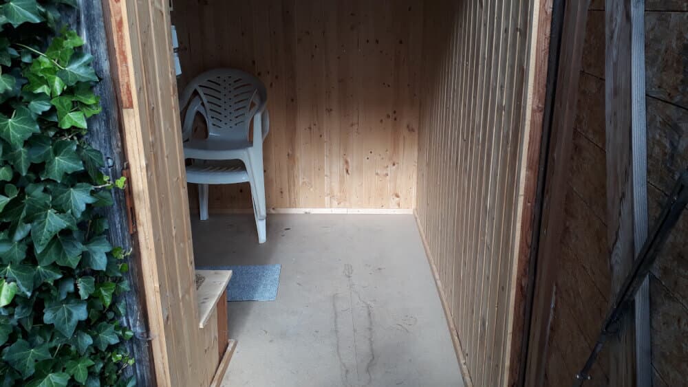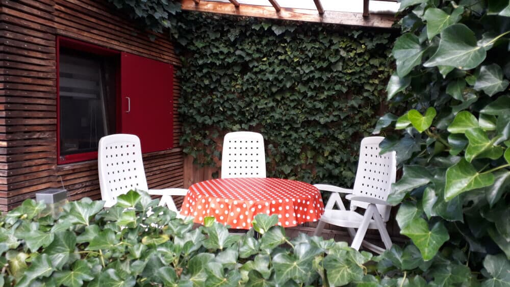 Das Ferienhaus bietet auf 60 Quadratmetern Platz für bis zu 2 Personen und erstreckt sich über zwei Etagen. Im Erdgeschoss befinden sich ein offener Essbereich mit Küchenzeile und ein Badezimmer. Der Essbereich verfügt über einen Essplatz. Die Küchenzeile ist mit Elektroofen, Kühlschrank, Mikrowelle, Kaffeemaschine, Wasserkocher und Toaster voll ausgestattet. Das Badezimmer verfügt über Dusche, WC und Waschbecken. Im Obergeschoss befindet sich ein offener Wohn- und Schlafraum mit einem Doppelbett. Sie haben Zugang zu einem Balkon und zu einer idyllischen Terrassenlaube. Ein Garten kann nicht genutzt werden. Eine Fahrradgarage und ein Stellplatz stehen Ihnen zur Verfügung.