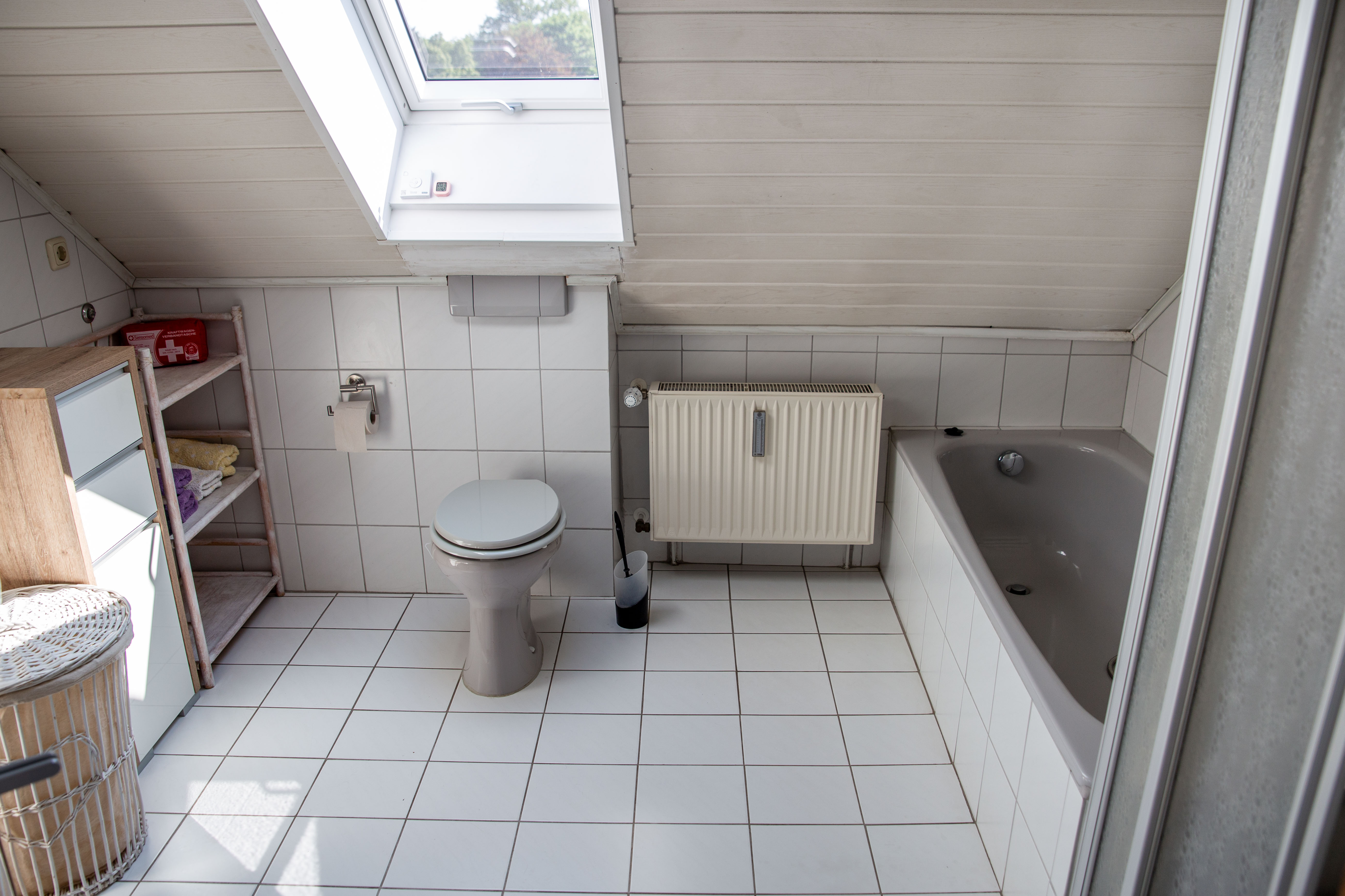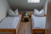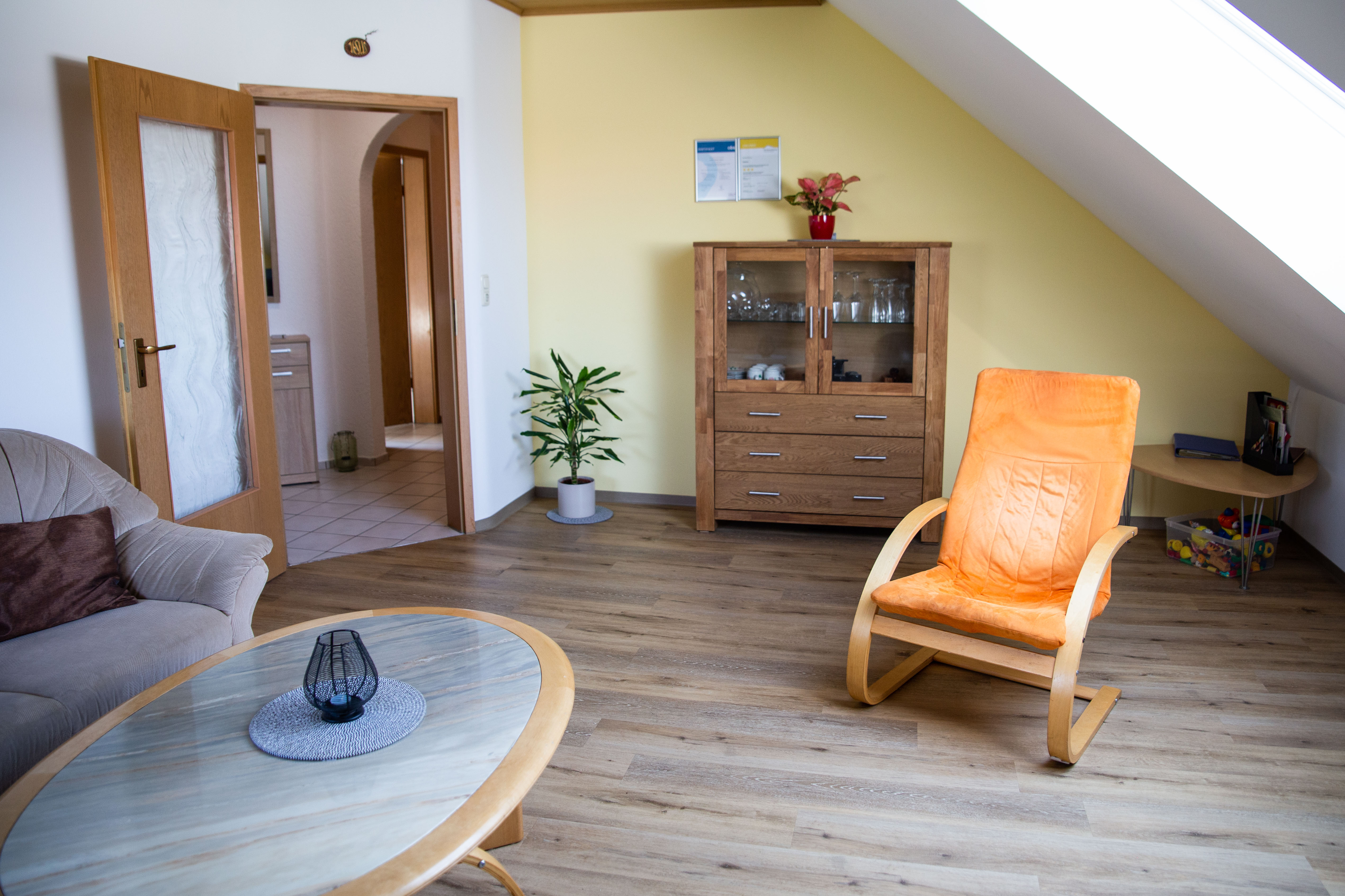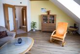 Unsere Dachgeschosswohnung hat 3 Schlafräume mit 6 Betten, ein geräumiges Wohnzimmer, eine voll eingerichtete Wohnküche sowie ein ein Bad mit Wanne, Dusche und 2 WC. Freies W-LAN sowie SAT-TV und Radio sind vorhanden.