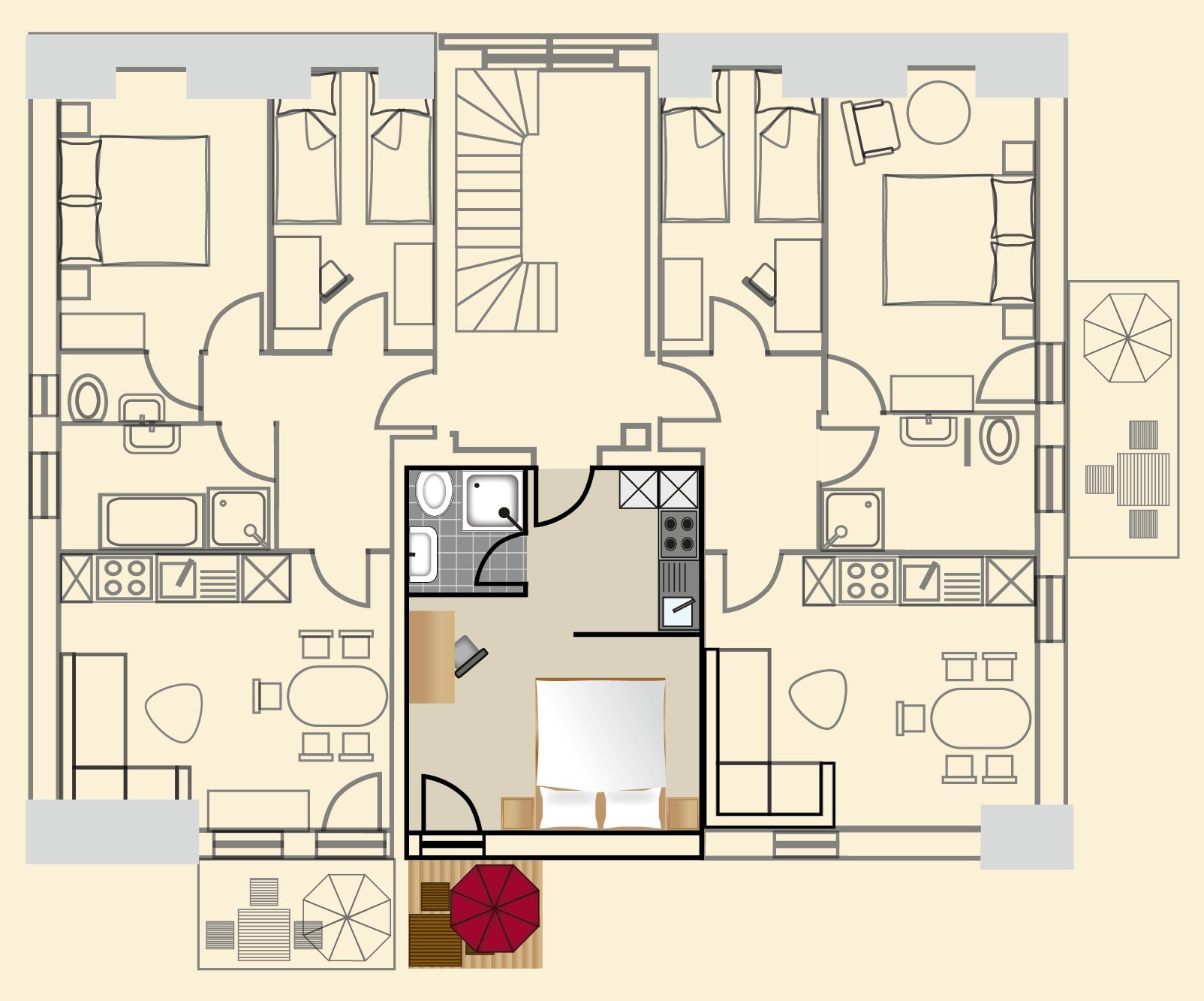 Für unser Appartment Grafenmühle steht Ihnen ein mordern eingerichtetes Doppelbettzimmer mit Wohnraum und Flachbildfernseher, Küchenblock mit Elektroherd und Backofen, Kaffeemaschine, Kühlschrank mit Gefrierfach, Eierkocher, Toaster, Mikrowelle zur Verfügung.